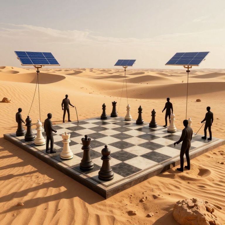A surreal 3D-rendered desert landscape features a colossal chessboard where faceless figures operate gravity-defying levers and pulleys powered by solar winds, creating a striking contrast between the ancient game and futuristic mechanics under dramatic golden-hour lighting.