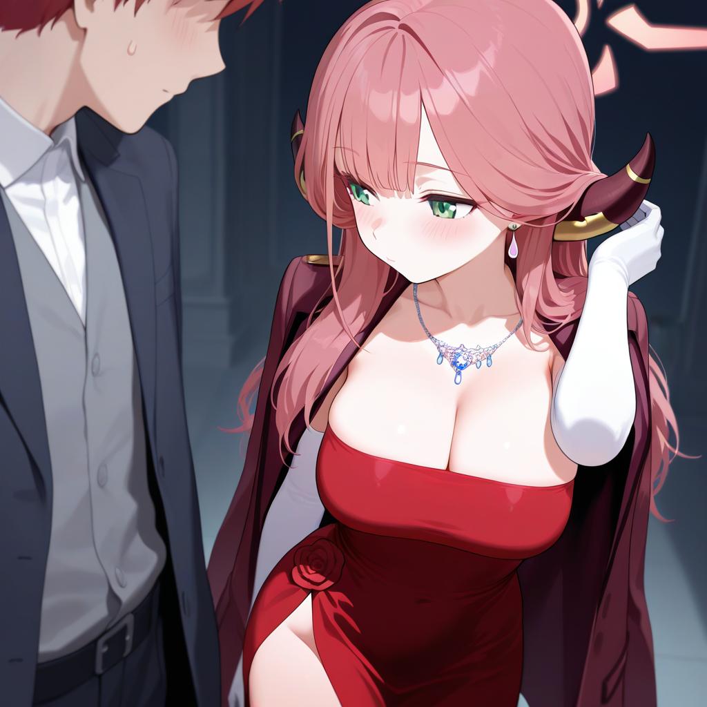 Aru (dress) (blue archive), blue archive, 1girl, demon horns, brown horns, yellow eyes, pink hair, long hair, red hair, large breasts, cleavage, collarbone, red dress, white gloves, coat on shoulders, strapless dress, elbow gloves, red coat, jacket on shoulders, halo, pink halo, earrings, necklace, side slit, by artist pumpkinspicelatte, illustrious