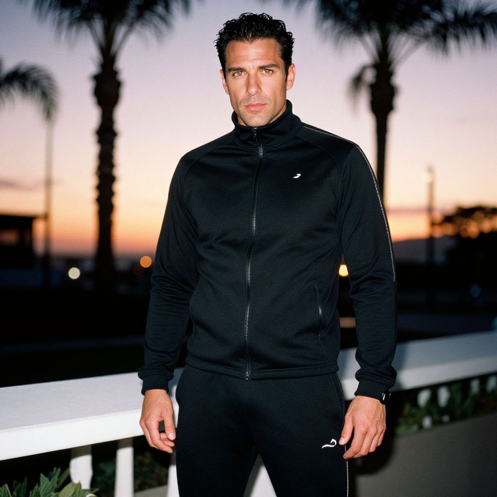 A man, athletic zip-up jacket, sleek black with reflective details, fitted sweatpants, soft fleece material, outdoor terrace with palm trees, vibrant sunset views, Ilford film stock, relaxed expression, enjoying the moment. Man has masculine face and piercing eyes