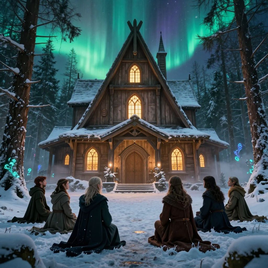 Digital artwork depicting a snow-covered, wooden cottage with glowing yellow windows, set in a forest under a vivid green and blue aurora. Six people, dressed in medieval-style, dark, woolen cloaks, sit on the snowy ground with their backs to the viewer, facing the cottage. Blue LED lights adorn the trees on either side. The scene is illuminated by the cottage's warm light and the ethereal glow of the aurora. Tall, dark evergreen trees surround the cottage, creating a serene, magical winter night atmosphere.