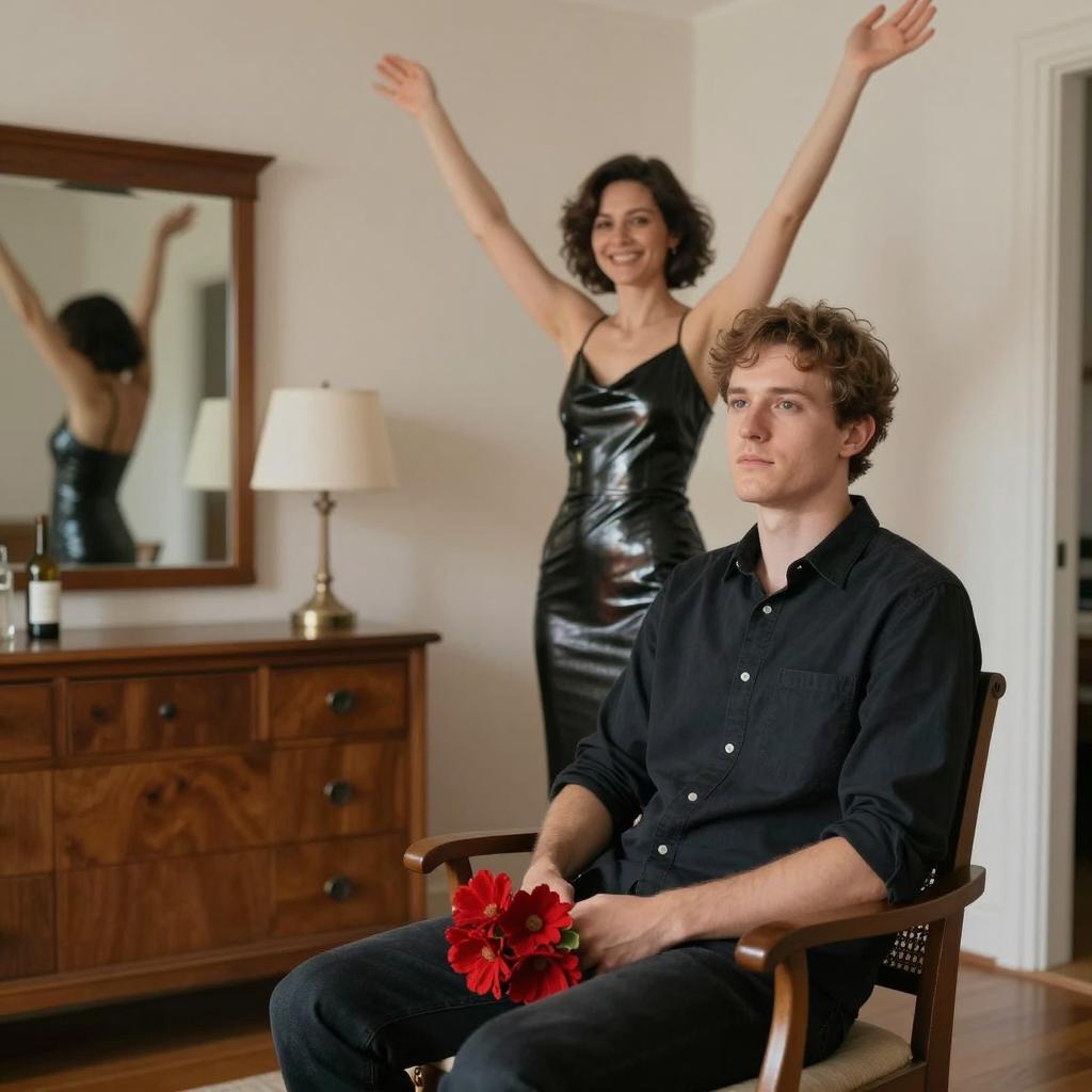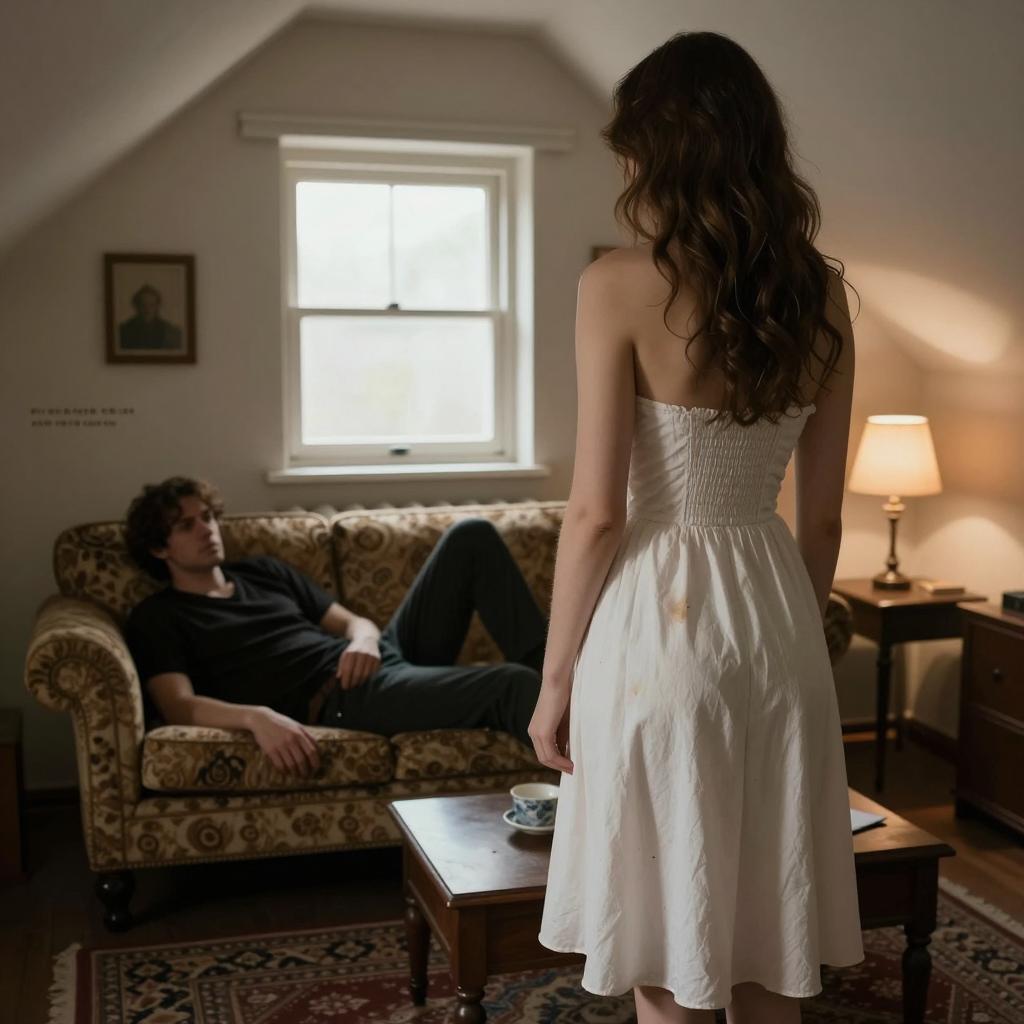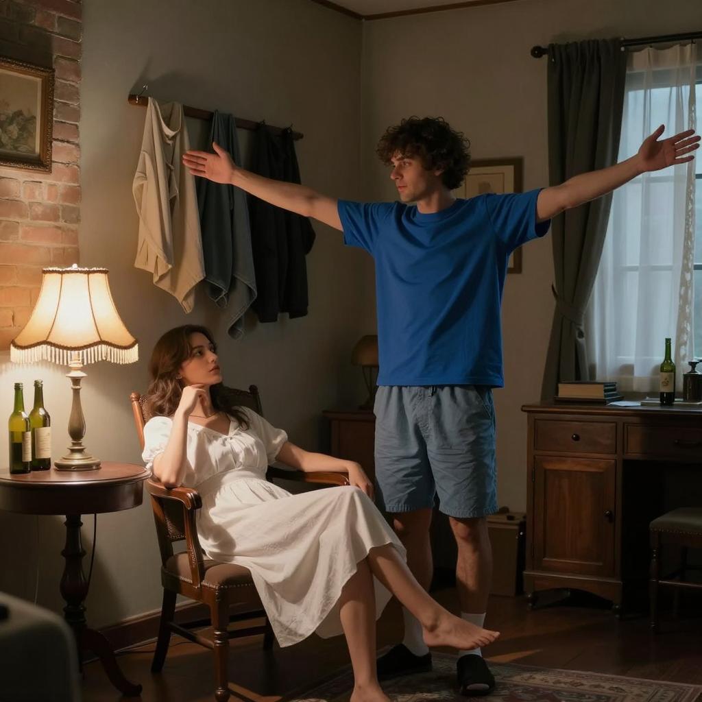 Man in blue shirt and shorts, standing with arms outstretched, in dimly lit room. Woman in white dress, reclining on chair, hand on chin. Table with lamp and bottles on left. Brick wall and curtains in background. Lampshade with frilled edge. Various clothing items hanging on wall. Wood furniture and a window with curtain on right. Two people.