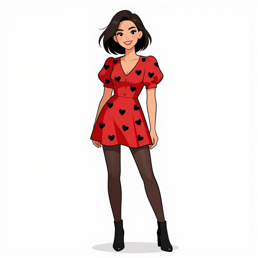 Digital illustration of a smiling woman with short black hair, wearing a red dress with black heart patterns, black tights, and black ankle boots, standing