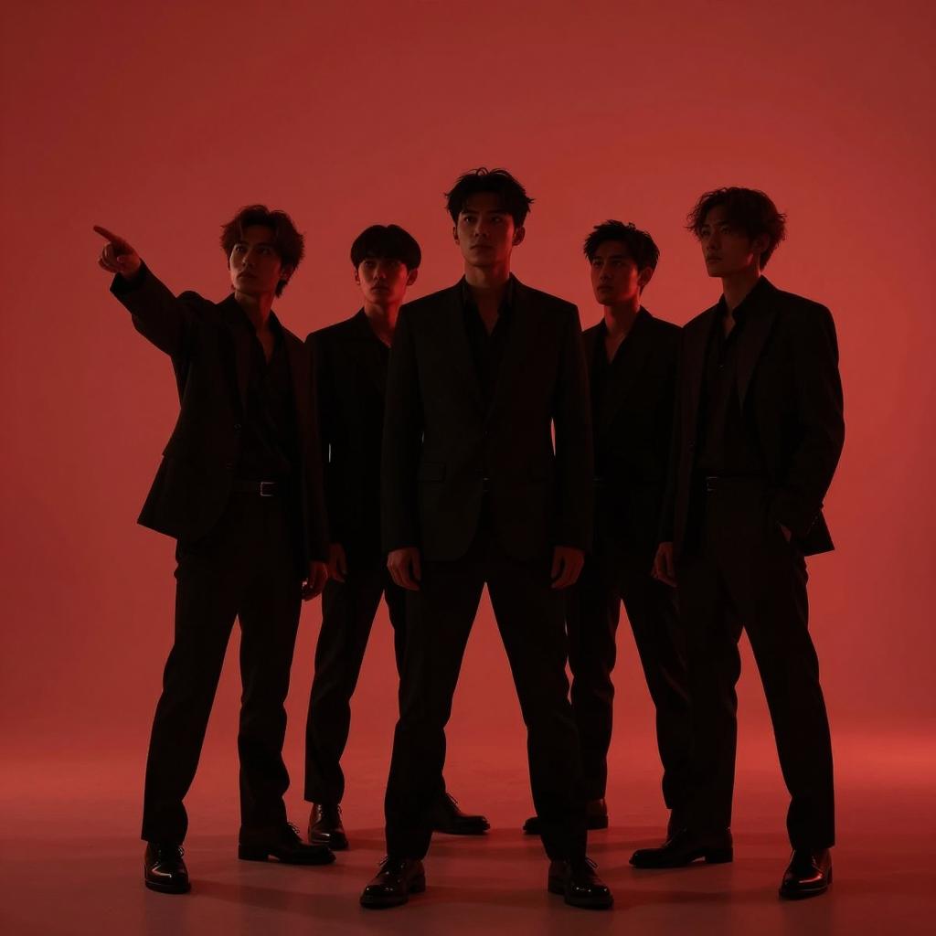 Silhouetted group of five people against a red background. One person on the left points forward, others stand in a semi-circle. Black suits, one person with a distinctive jacket. Standing, facing forward, intense interaction.