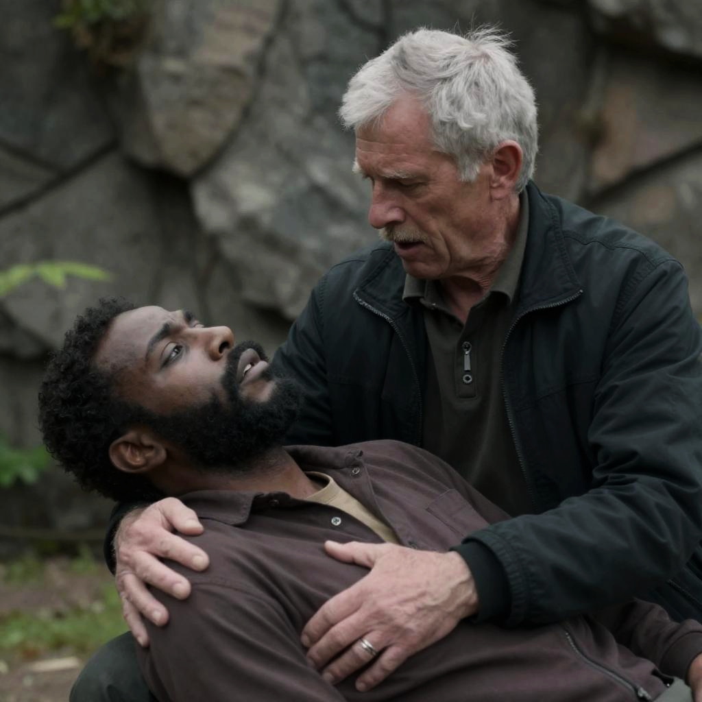 Old white man with gray hair, wearing black jacket, cradles unconscious dark-skinned man with black beard, brown shirt, against rocky background. Man's face shows concern. Rock wall and greenery on the left. Intense expressions. Two people.