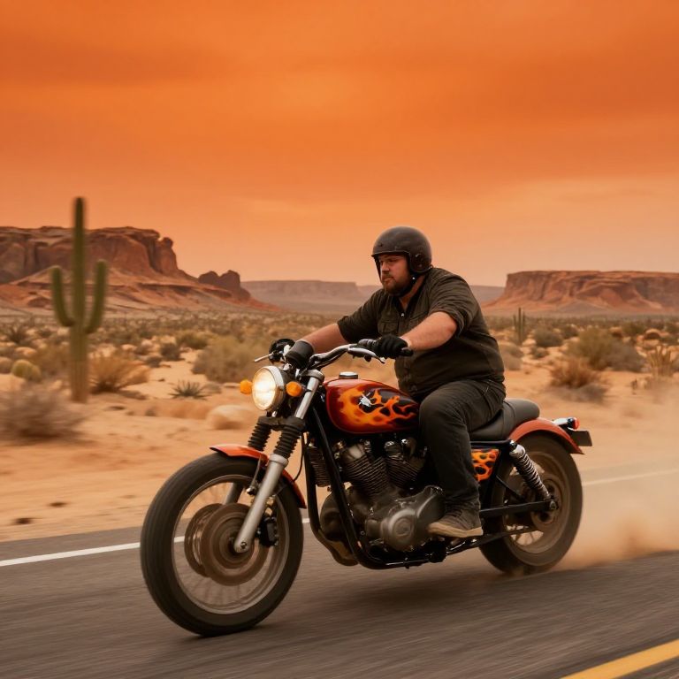 Fat guy riding motorcycle along a desert highway under a dramatic orange sky, dusty environment with cacti and rocky formations, wearing rugged biker gear, vintage-style motorcycle with flames painted on the tank, action-packed, detailed landscape