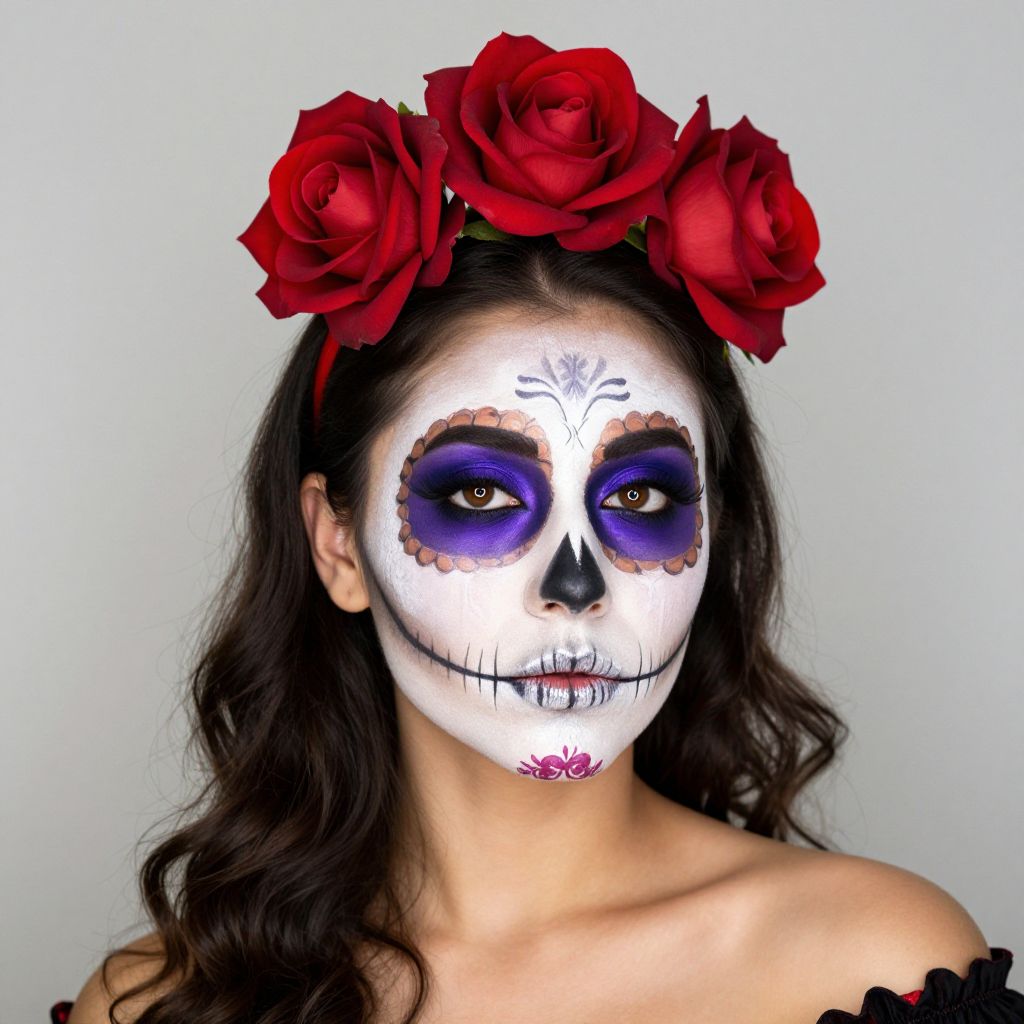 Photograph of a woman with white and purple sugar skull face paint, black wavy hair, and a red rose flower crown.