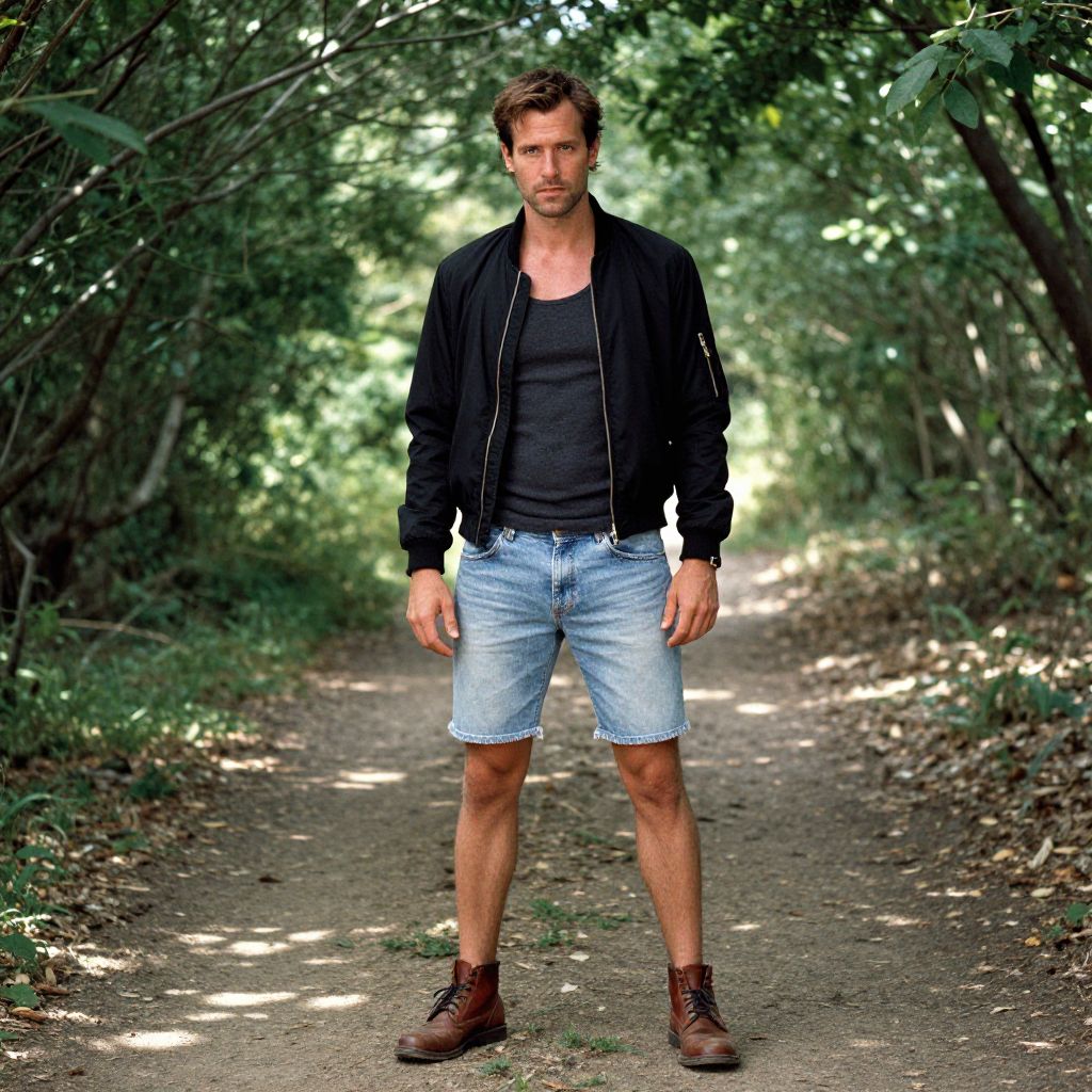 A man, faded blue denim cutoff shorts, black bomber jacket, charcoal tank top, brown leather chukka boots, rugged look, lush green canopy, winding dirt path, dappled sunlight filtering through leaves, anscochrome analog film, relaxed expression. Man has masculine face and piercing eyes