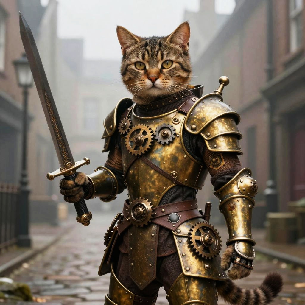 Cat soldier art showcasing a steampunk cat warrior, brass armor with gears and cogs, holding a mechanical sword, misty Victorian street setting, richly textured details