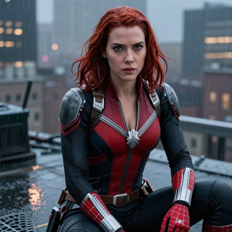 Photograph of a red-haired woman with pale skin, wearing a tight-fitting, red and black Spider-Woman suit with metallic shoulder plates and web-patterned gloves. She is crouched on a rain-soaked rooftop, with blurred city buildings and glowing windows in the background. Her expression is intense and focused. The suit has a silver star emblem on the chest. Her hair is wet and windswept, adding to the dramatic atmosphere. The texture of the suit is sleek and form-fitting, contrasting with the rough, wet rooftop beneath her.