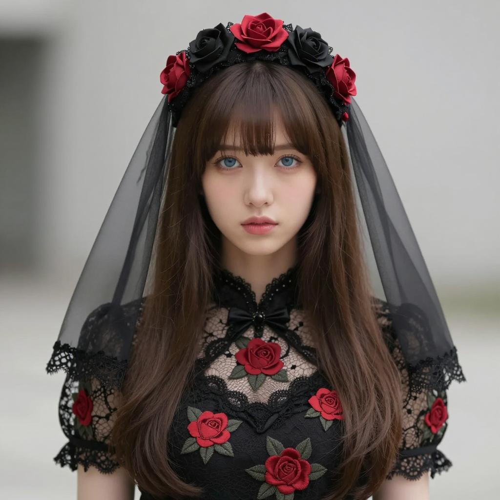 Portrait of a gothic-style Asian woman with long brown hair and bangs, wearing a black lace dress adorned with red floral embroidery and black lace sleeves. She has a black veil decorated with red roses and delicate lace trim. The woman has pale skin and a neutral expression, with her right hand gently touching her neck. The background is softly blurred light grey, emphasizing the subject.