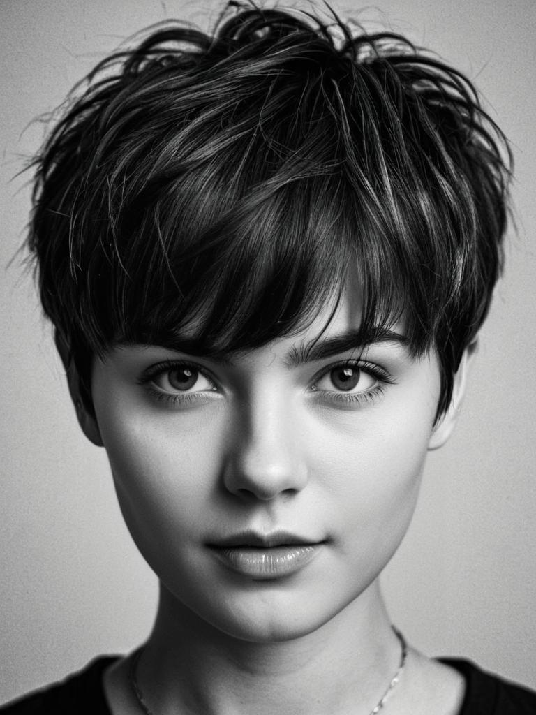 Woman with Messy Pixie Cut and Bangs hairstyle, photorealistic detailed headshot