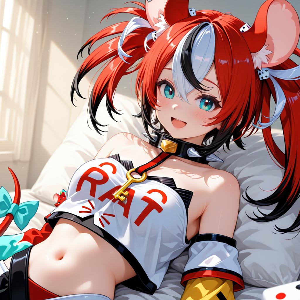 Mr. squeaks (hakos baelz), hololive, 1girl, mouse girl, mouse ears, mouse tail, animal ear fluff, sharp teeth, tail bow, blue eyes, hair between eyes, red hair, streaked hair, black hair, white hair, long hair, dice hair ornament, twintails, medium breasts, navel, white shirt, spiked collar, bare shoulders, detached sleeves, virtual youtuber, virtual youtuber, mouse (animal), midriff, key, by artist kusano (torisukerabasu), leet
