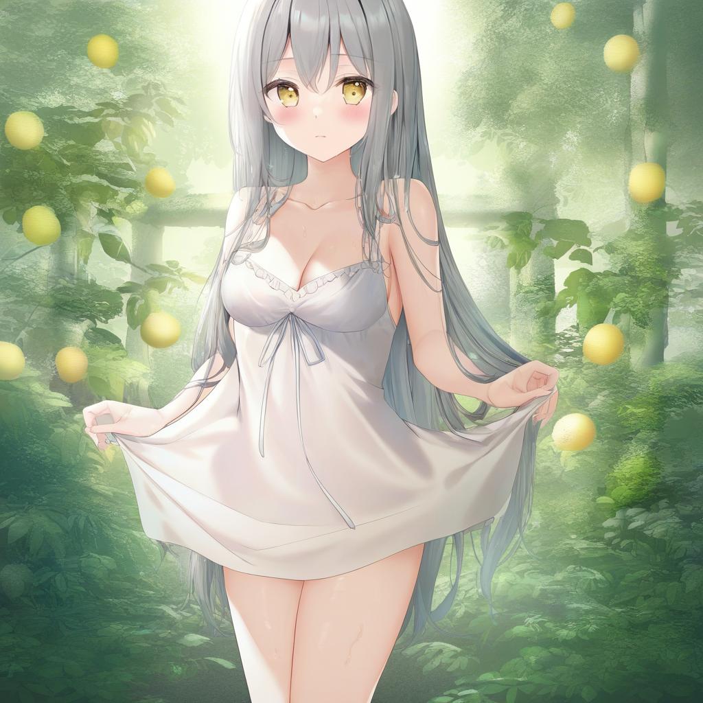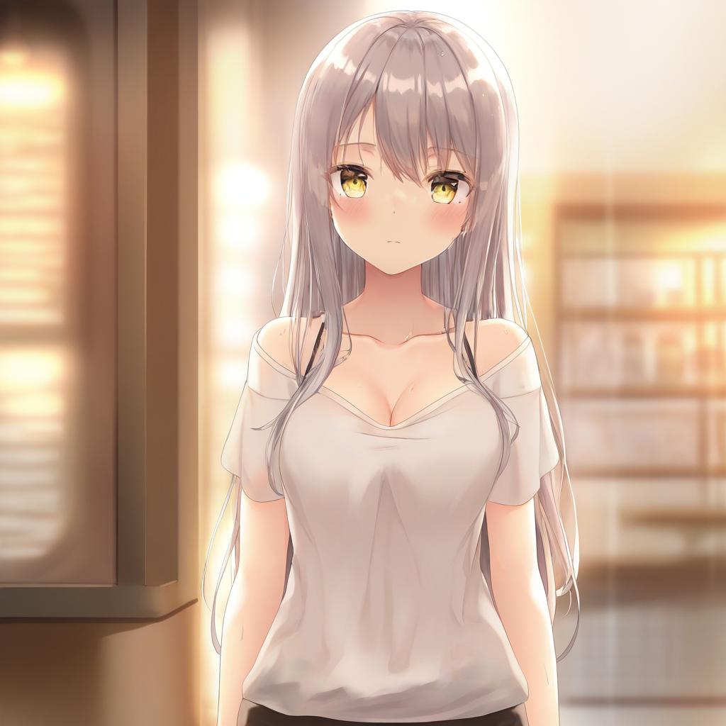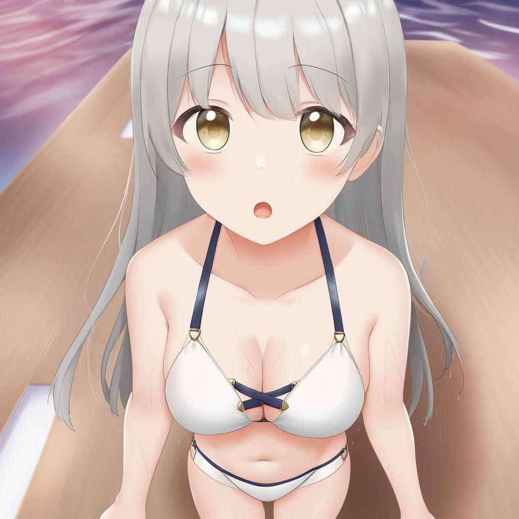 1girl, long hair, grey hair, yellow eyes, looking at viewer, cowboy shot, medium breasts, cleavage, bare shoulders, wet hair, open mouth, :o, standing, detailed anatomy, tank top, mountain trail, morning light, adventurous