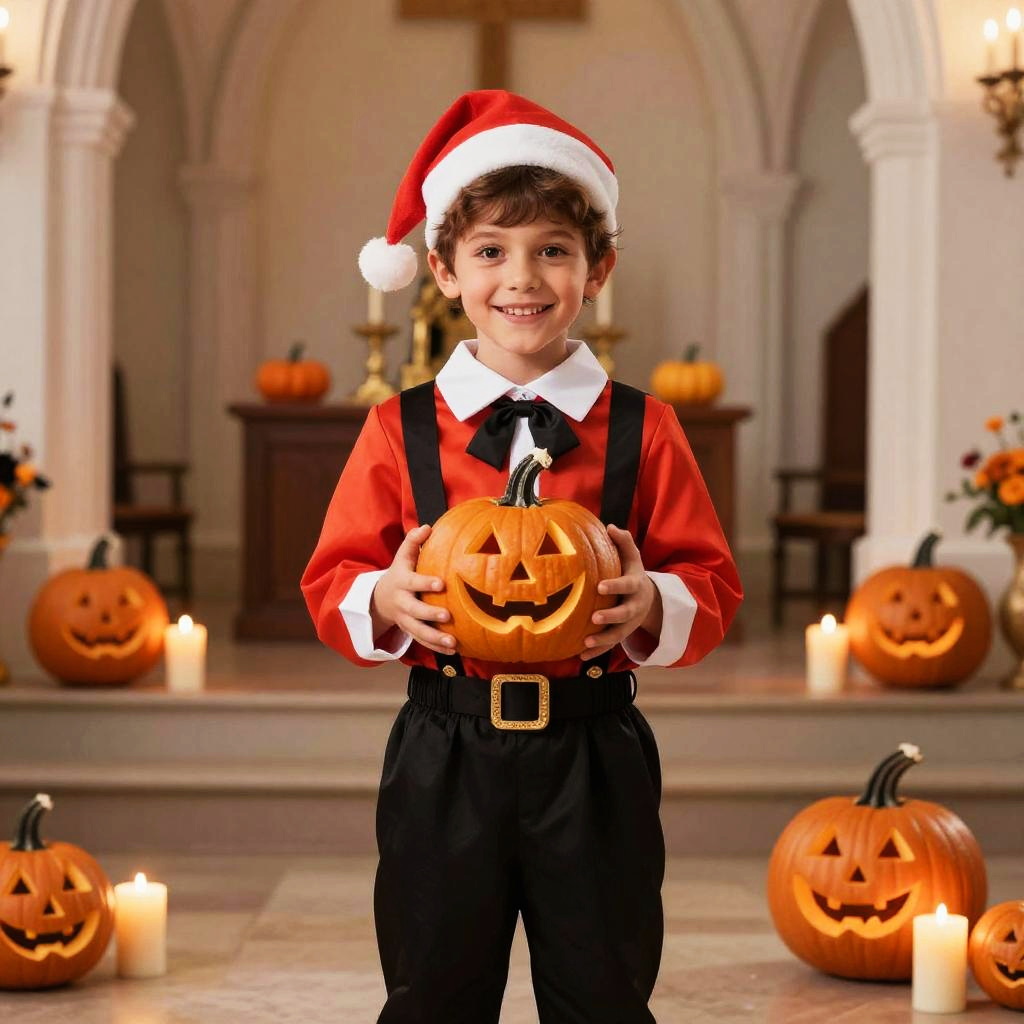 Nun Halloween Costume Boy, nun in a church with pumpkins and candles in the background