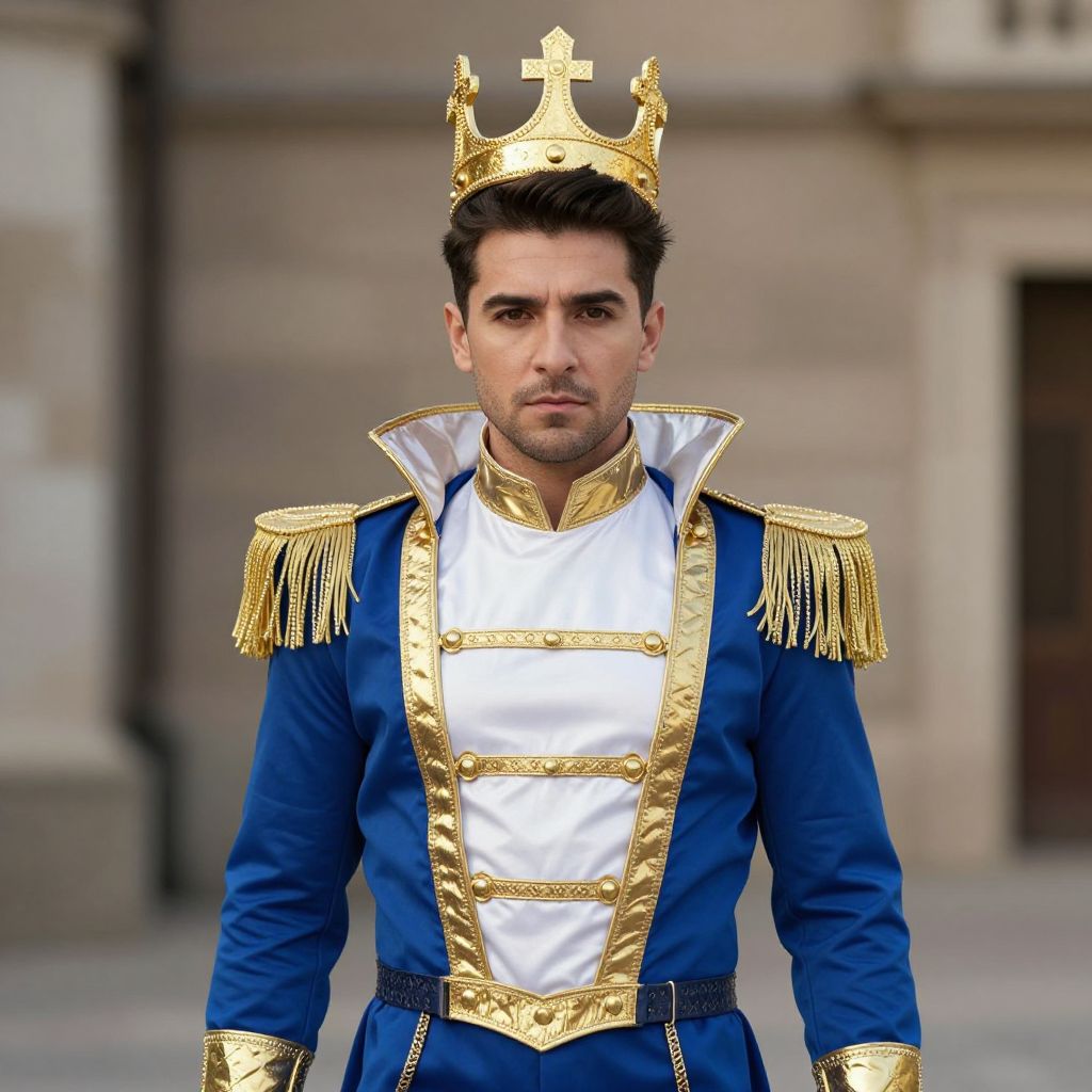 Photograph of a handsome man with short, dark hair and a serious expression, wearing a royal blue military-style uniform adorned with gold trim and fringes, a white shirt with gold buttons, and a gold crown. His uniform features ornate gold epaulettes and a high collar. The background is a blurred, beige stone building, suggesting an outdoor urban setting. The man's strong jawline and piercing eyes add to his regal appearance. The image has a realistic, slightly enhanced digital effect.