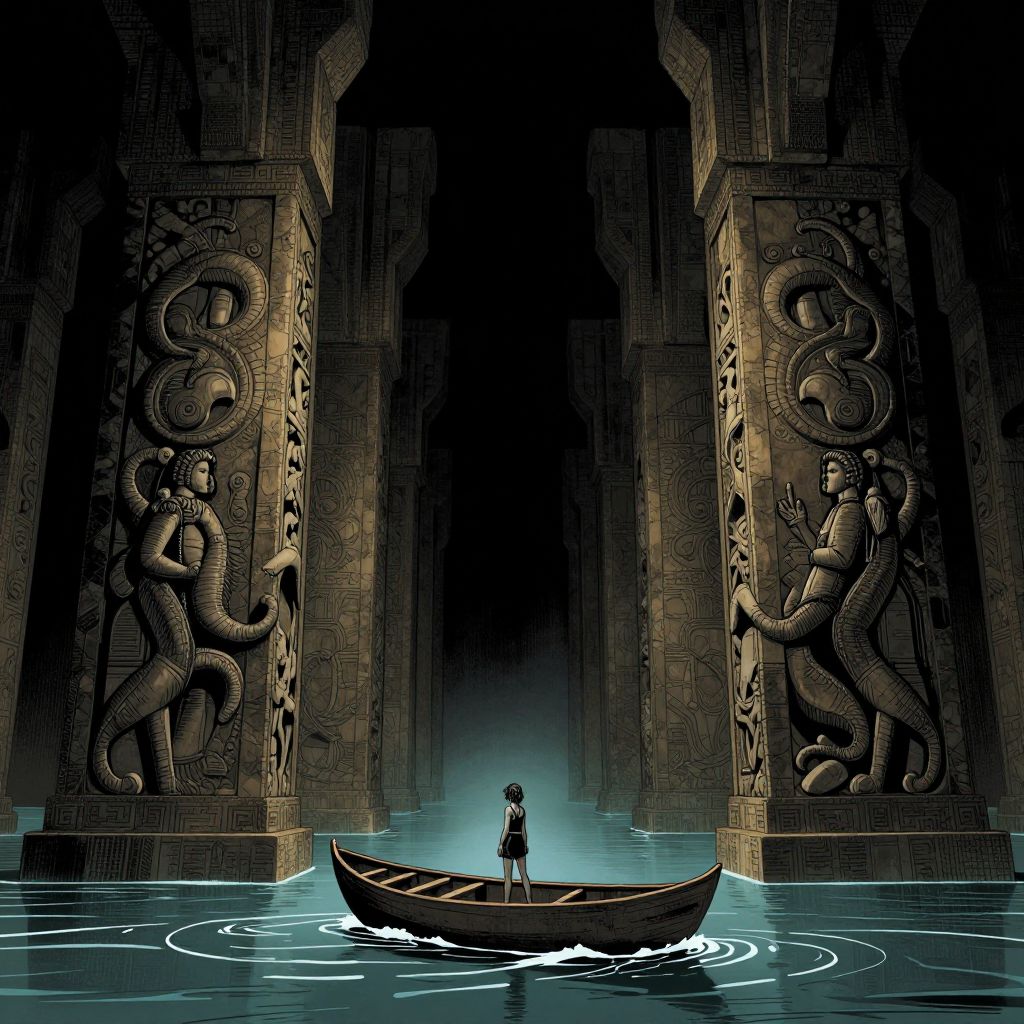 A digital illustration depicts a lone figure in a small wooden boat standing at the center of a mystical, illuminated waterway. The figure, dressed in dark clothing, faces tall, ancient stone pillars adorned with intricate, carved serpents. The pillars, bathed in dim light, frame a dark, shadowy background. The water is a glowing, teal blue, reflecting the light from beneath the boat. The scene is rich in contrast, with dark shadows and glowing highlights, evoking a sense of mystery and ancient magic. The overall style is reminiscent of fantasy art, with a focus on detailed textures and dramatic lighting.