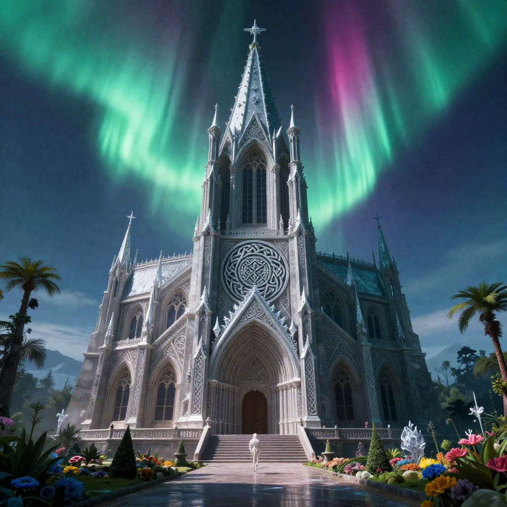A beautiful and highly detailed digital painting of an elven cathedral in a beautiful garden in a auroral tundra, polar aurora palette (emerald, fuchsia, icy silver), celtic, labyrinthine Celtic knotwork interwoven with frost-crystal geometry, intricate details, epic scale, insanely complex, cgsociety, 8 k, sharp focus, hyperrealism, by alex grey, caspar friedrich, albert bierstadt, james gurney, brian froud