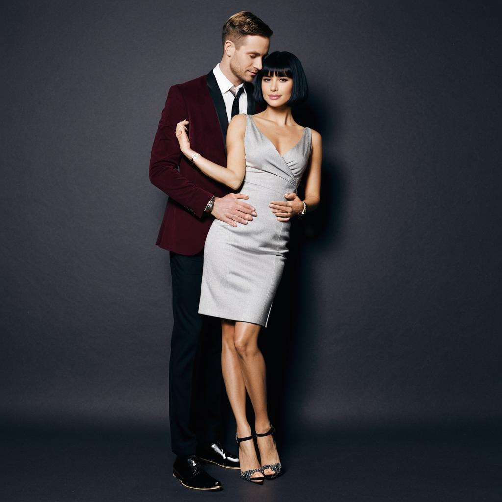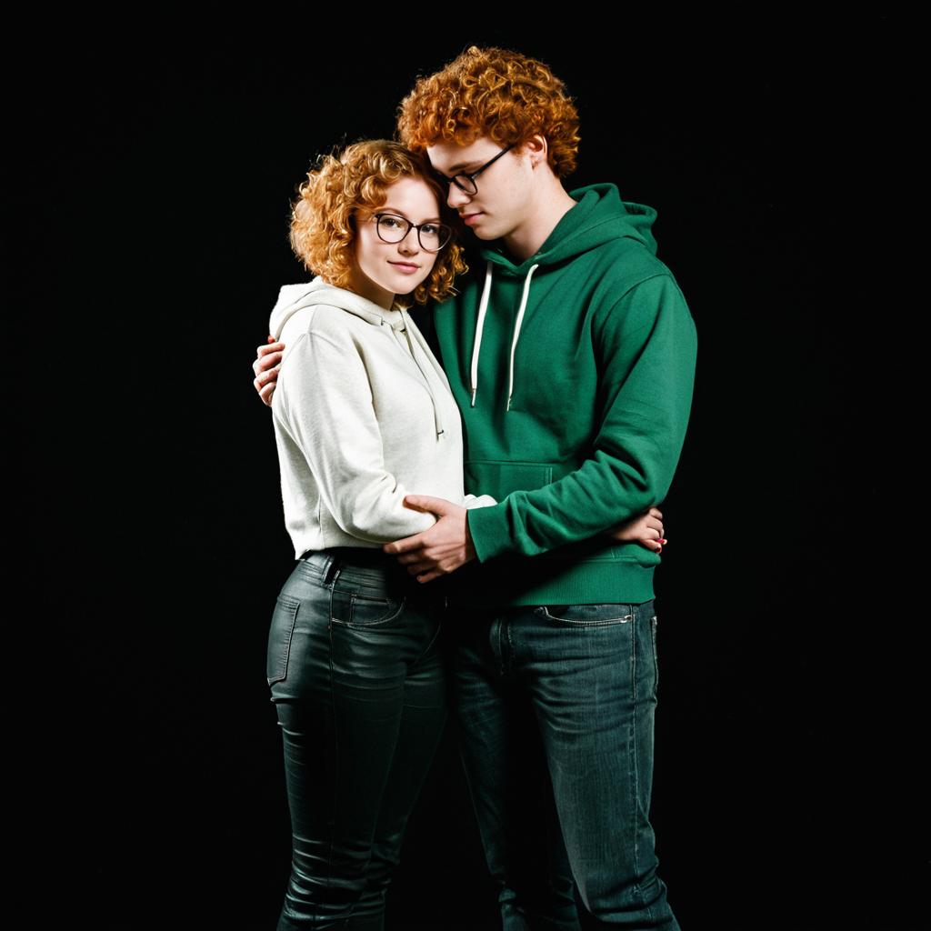 Full body, couple, elderly woman with short silver hair, wearing a light lavender cardigan over a white blouse and beige pants, middle-aged man with curly black hair, wearing a Navy blue suit with a light purple tie, arm around waist, hug, breast press, standing, emphasizing warmth by holding hands, pearl necklace, black background
