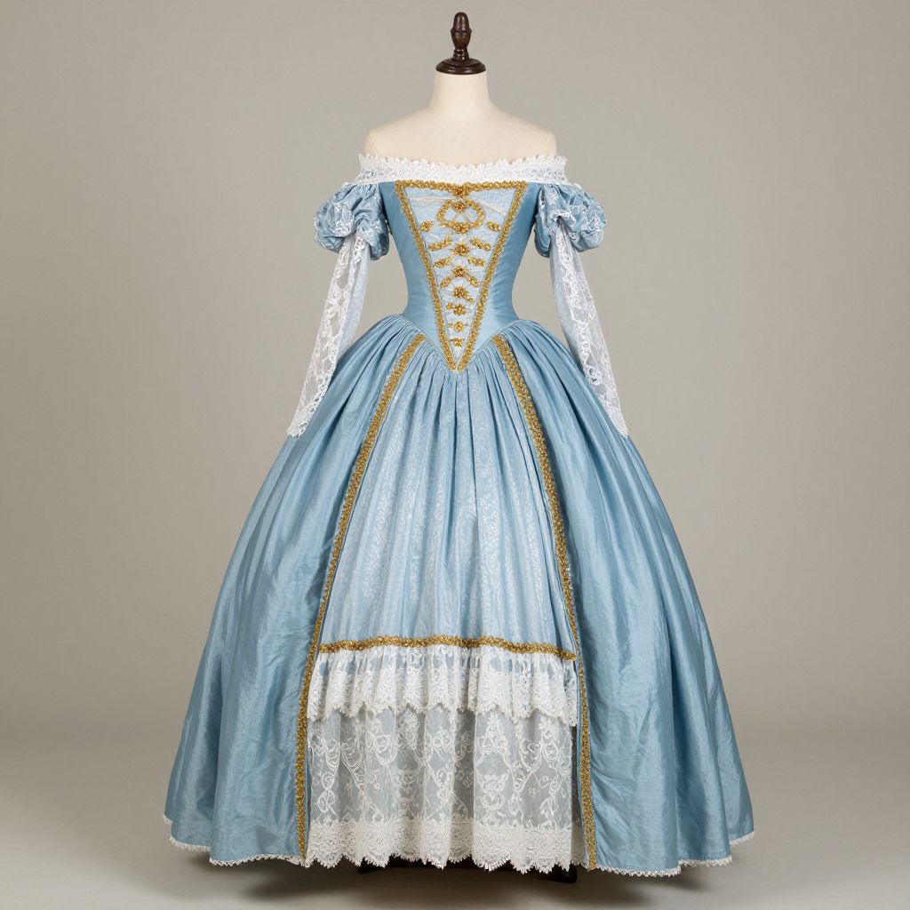 Elegant woman modeling a vintage blue Renaissance-inspired ball gown featuring off-the-shoulder lace detailing, puffed sleeves, and a fitted bodice with gold embellishments, set against a plain backdrop.