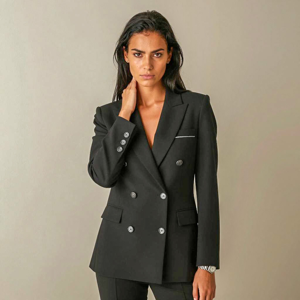 Woman with dark hair in a ponytail, wearing a black blazer, deep V-neck, black pants, and black boots, sitting on the floor. She holds a phone in front of her face, taking a mirror selfie. Gold necklaces and rings. Dark, minimal background. Arms and legs crossed. Tattoo on left hand. Dark, low-light photograph.