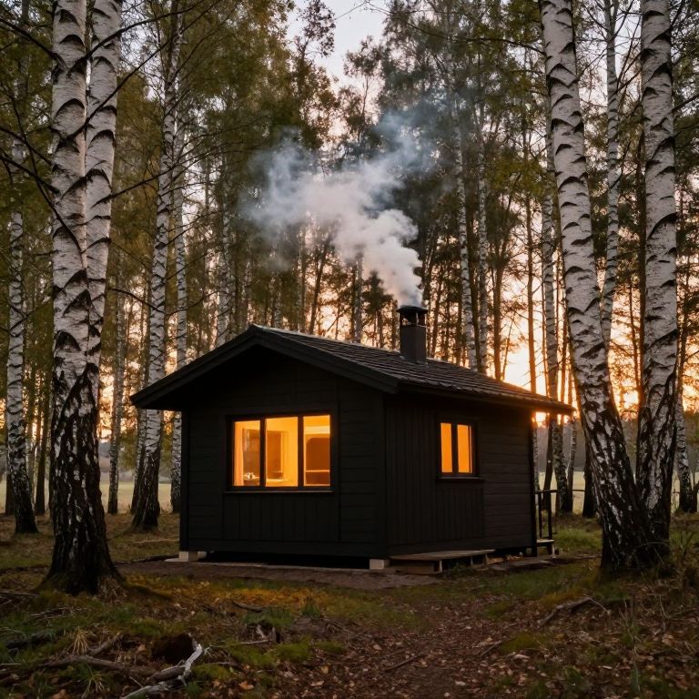 Birchwood cabin nestled in a tranquil forest clearing surrounded by tall birch trees, smoke coming from the chimney, warm glowing windows at sunset, cozy and inviting atmosphere with soft shadows and warm colors.