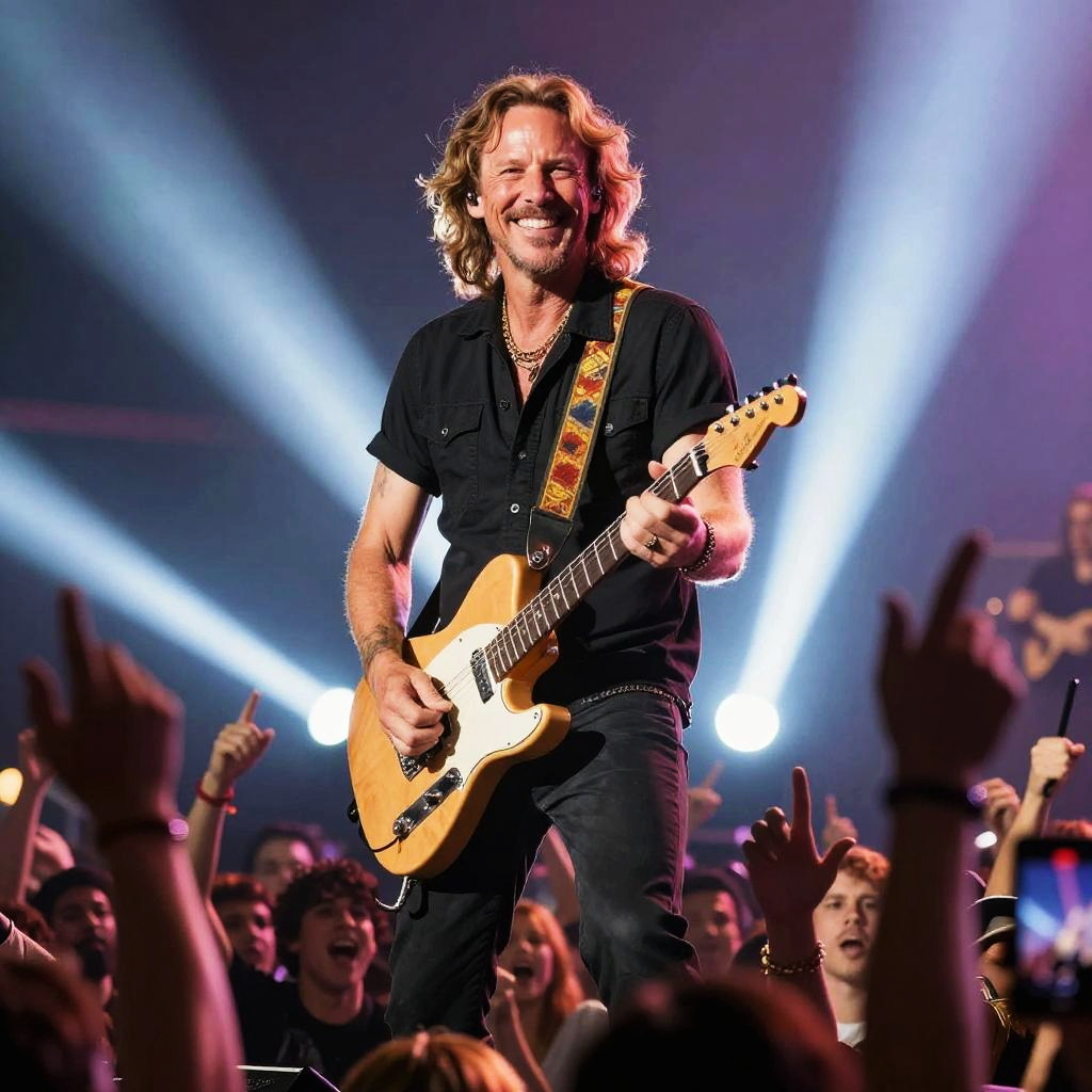 Peter Steele smiling confidently during a live concert, spotlight beams around him, electric guitar in hand, crowd energy illustrated with vibrant colors, dynamic and powerful composition