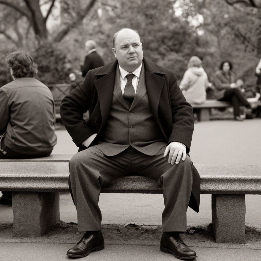 In this sepia-toned photograph, a man with a balding head and a slightly overweight figure sits on a stone bench in Central Park, New York City. His attire, consisting of a suit and a long coat, suggests a sense of style and perhaps a touch of vanity. The man's posture, with one hand resting on his hip and the other on his knee, exudes a sense of confidence and self-assuredness. The background, though blurred, reveals other park-goers and trees, adding depth to the scene. The overall composition, with the man as the central figure, draws attention to his presence and the narrative he might be portraying.