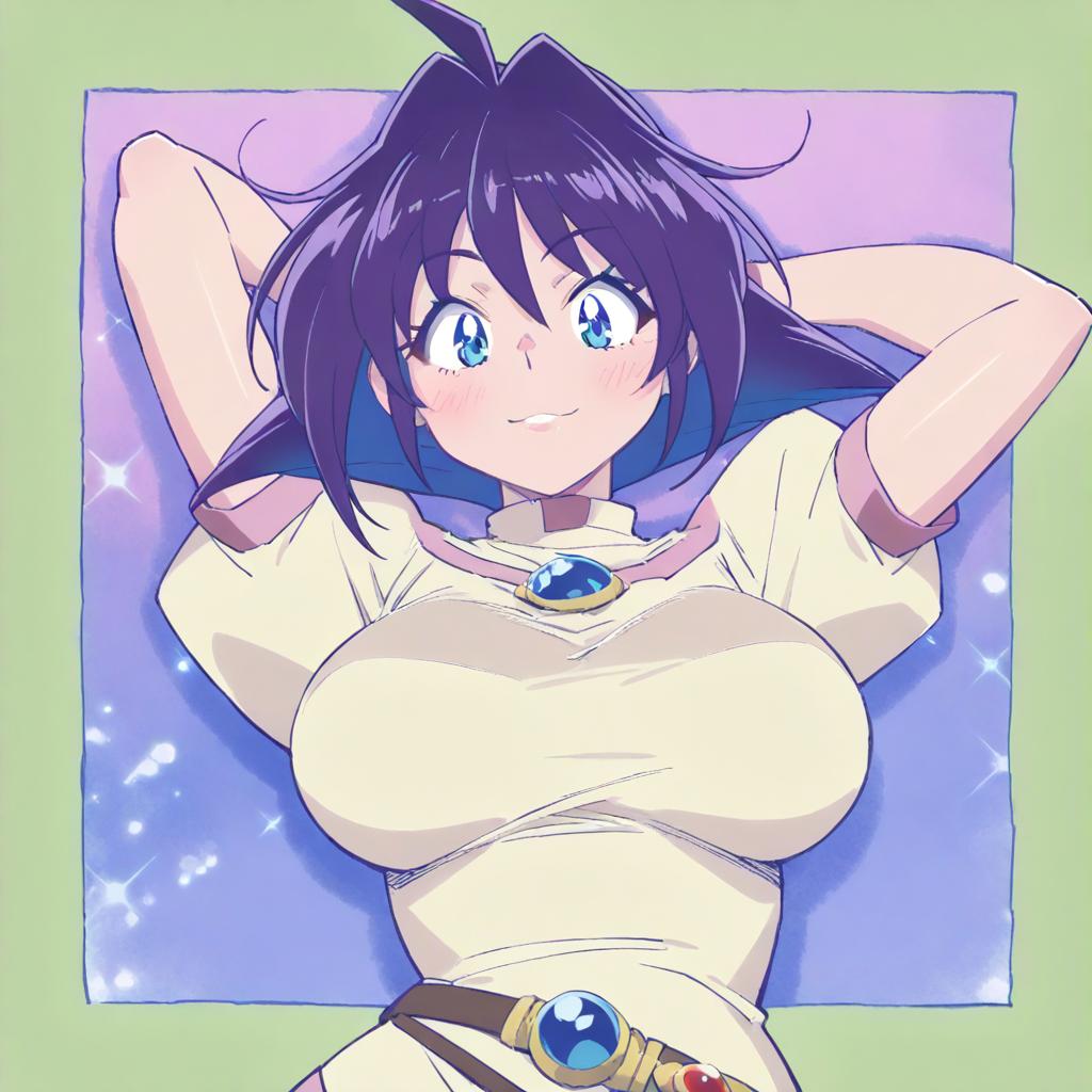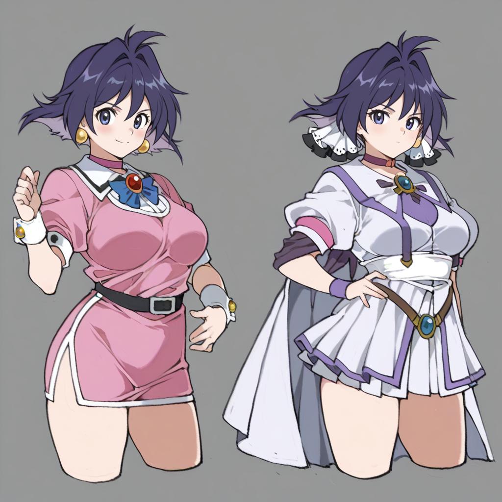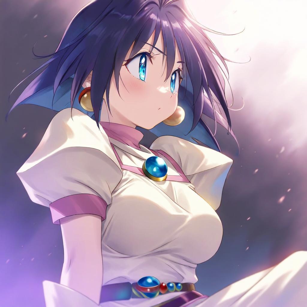 Amelia wil tesla seyruun, slayers, 1girl, blue eyes, short hair, purple hair, medium breasts, large breasts, pink choker, by artist miyagoe yoshitsuki, animagine