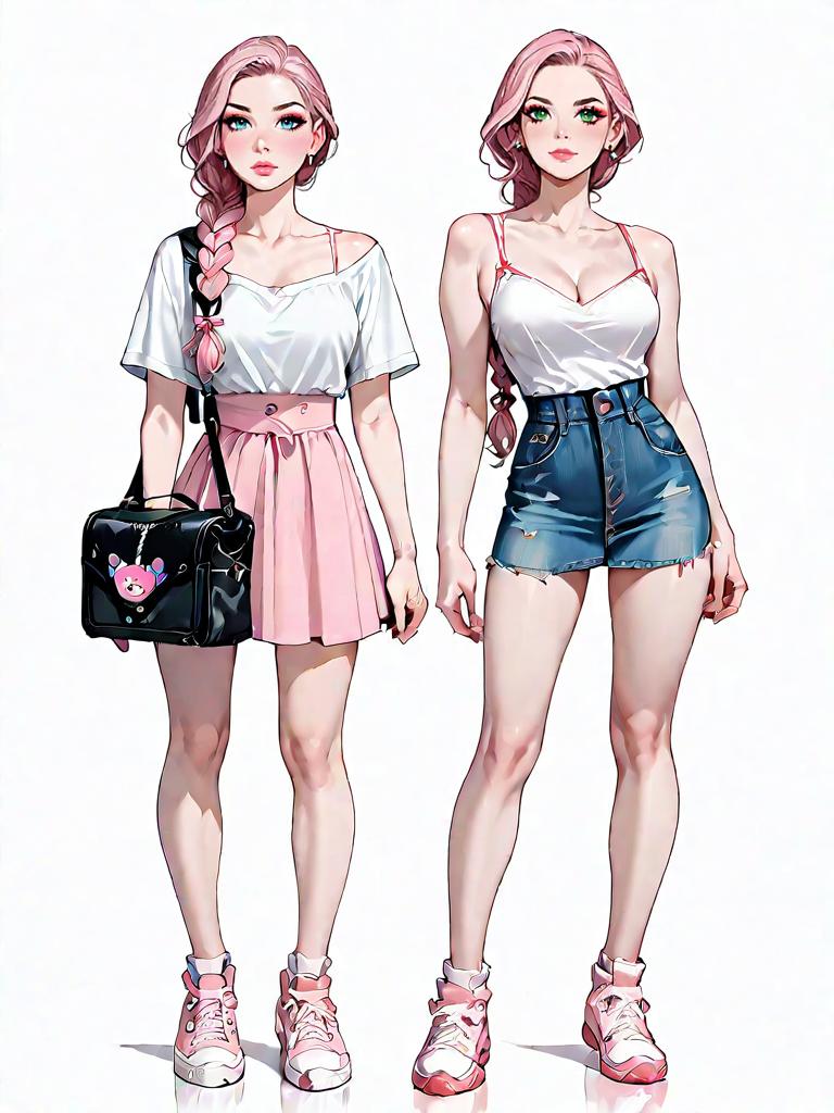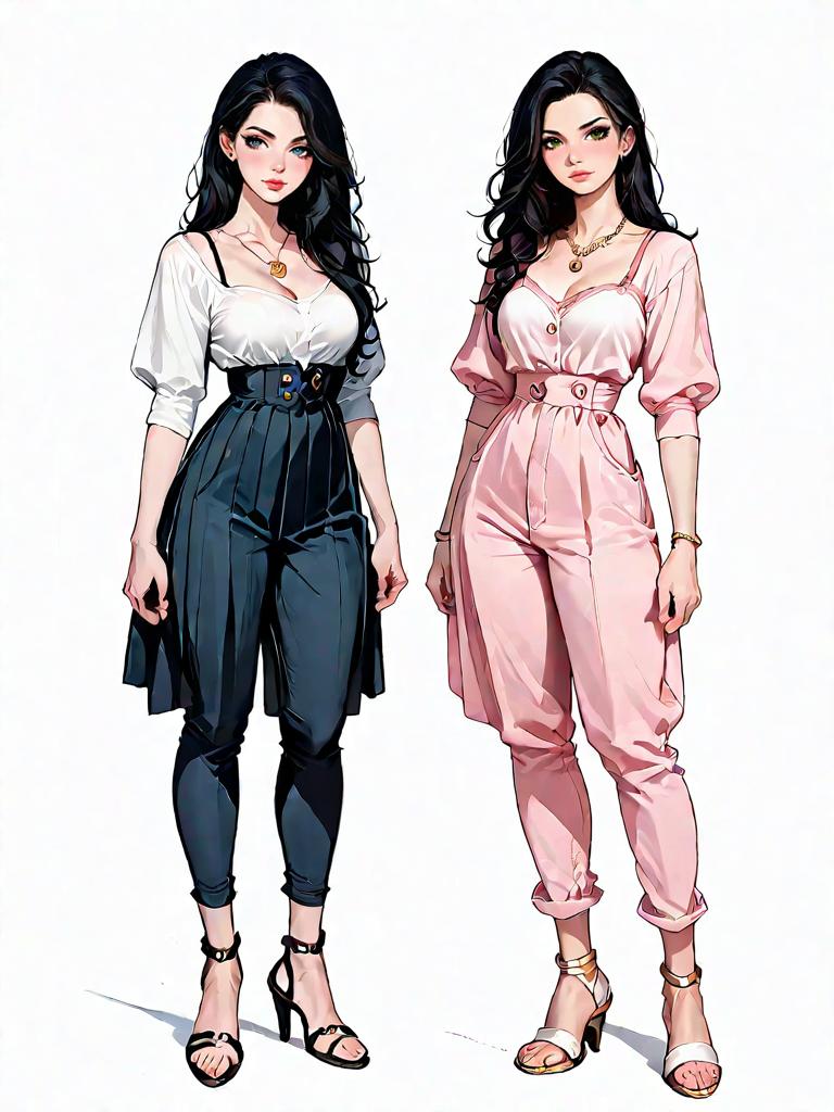 1girl, source_comics, realistic face, full body shot, Woman, casual streetwear, mustard yellow t-shirt, fitted cropped length, round neckline, short sleeves, paired with grey checkered overalls, straight-leg cut, bib pocket with patch, side and back pockets, silver-tone hardware, adjustable shoulder straps, black lug sole derby shoes, straight hairstyle with blunt bangs, white studio background.