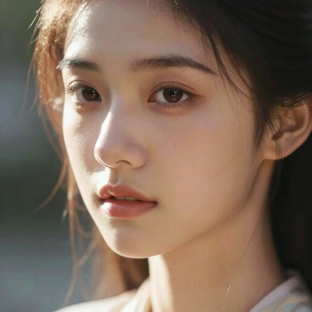 Close-up photograph of an East Asian woman with long dark hair, fair skin, and brown eyes, softly lit by sunlight.