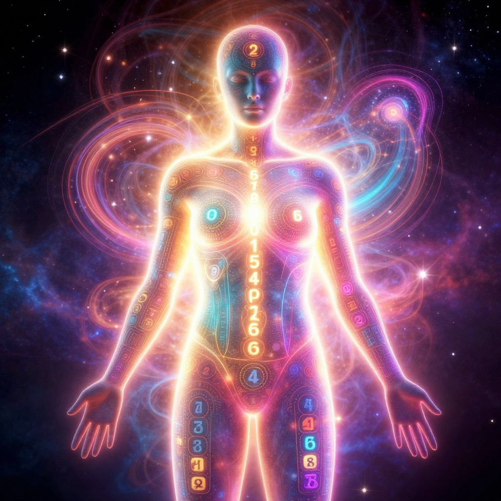Numerology concept art featuring a human silhouette with glowing numeric patterns mapped on the skin, surrounded by swirling light particles and starry cosmic elements, blending spirituality and metaphysics in a vibrant, colorful style
