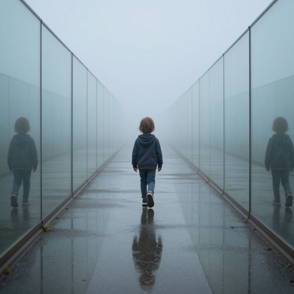 Photograph of a young child with short brown hair, wearing a dark blue hoodie, blue jeans, and black sneakers, walking away down a long, narrow, reflective corridor. The corridor is surrounded by tall, clear glass walls on both sides, creating a mirrored effect that doubles the child's image. The ground is wet, reflecting the child's and their mirror image, while the sky above is overcast, casting a bluish-gray light. The perspective emphasizes the child's small size and the corridor's length, creating a sense of isolation and introspection.