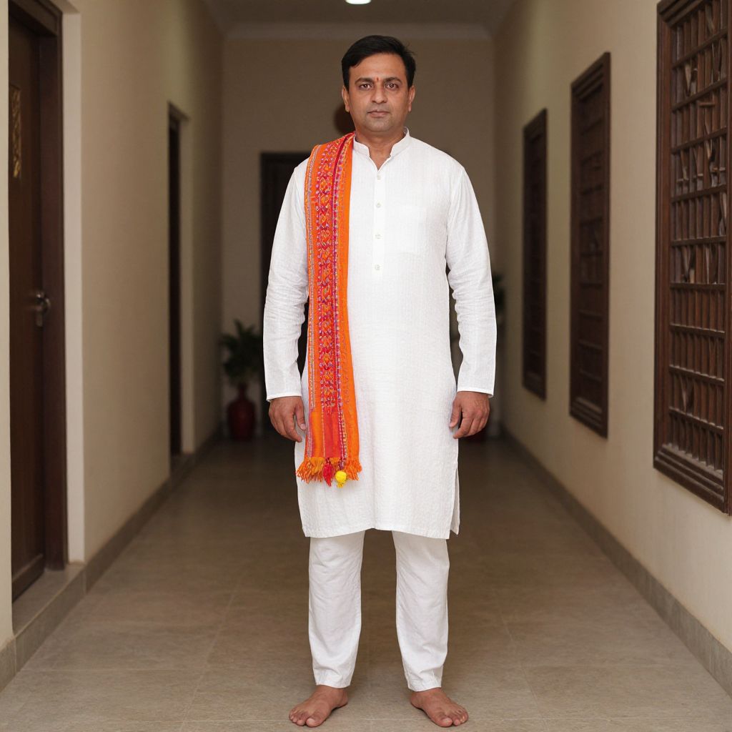 Photograph of a middle-aged Indian man standing in a long, narrow hallway. He has medium brown skin, short black hair, and is wearing a traditional white kurta and white pajama, barefoot. An orange, intricately patterned scarf drapes over his left shoulder. The hallway has cream-colored walls, brown wooden doors on the left, and brown barred windows on the right. The floor is tiled in a light beige color. The man stands centrally, facing the camera with a neutral expression. The lighting is even, highlighting the simplicity and traditional nature of his attire and setting.