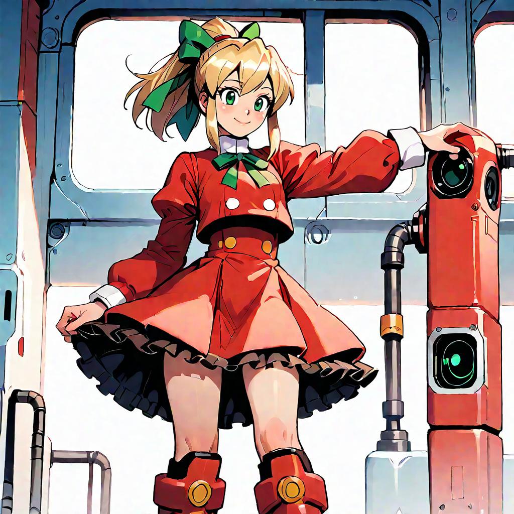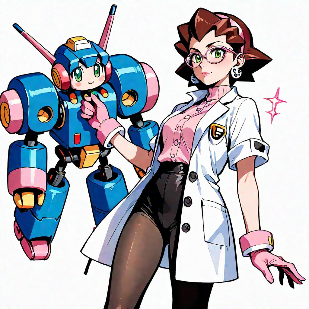 Score_9, score_8_up, score_7_up, source_anime, ishikawa hideki style, Tron Bonne (Mega man), green eyes, short hair, brown hair, jewelry, black pantyhose, earrings, open clothes, pink shoes, hair pulled back, pink gloves, pink hairband, crotch plate, pink t-shirt, lab coat, glasses, (Servbot (Mega man), mecha)