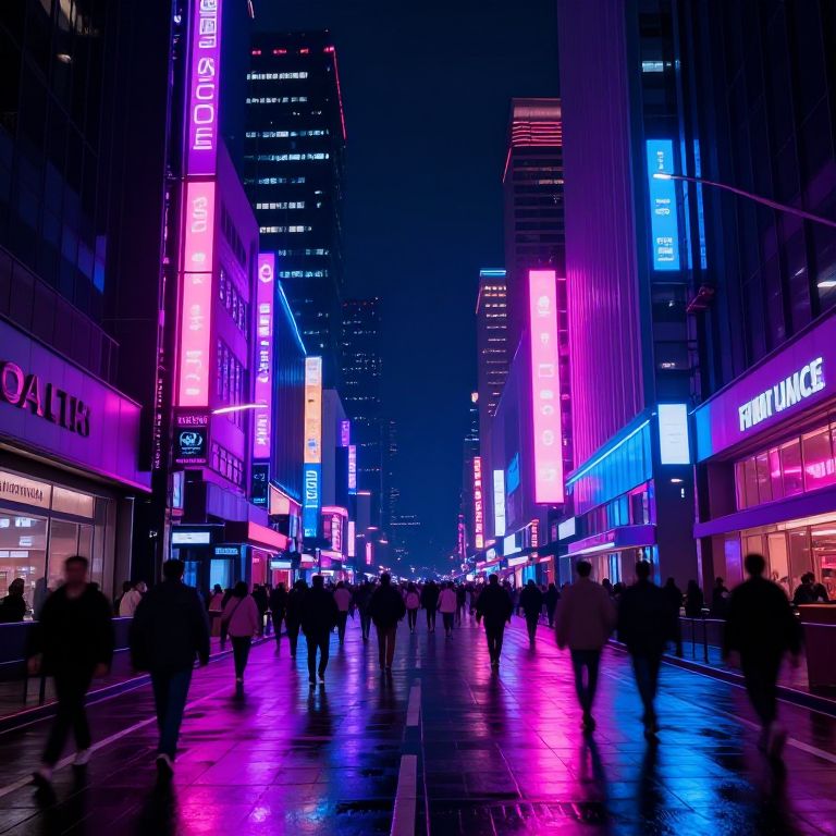Neon-lit, bustling urban street at night; colorful pink, purple, and blue signs reflect on wet pavement, silhouetted pedestrians walk