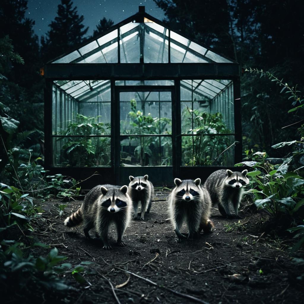 Raccoons breaking into an abandoned greenhouse, daytime scene, playful mood, soft lighting, realistic forest background