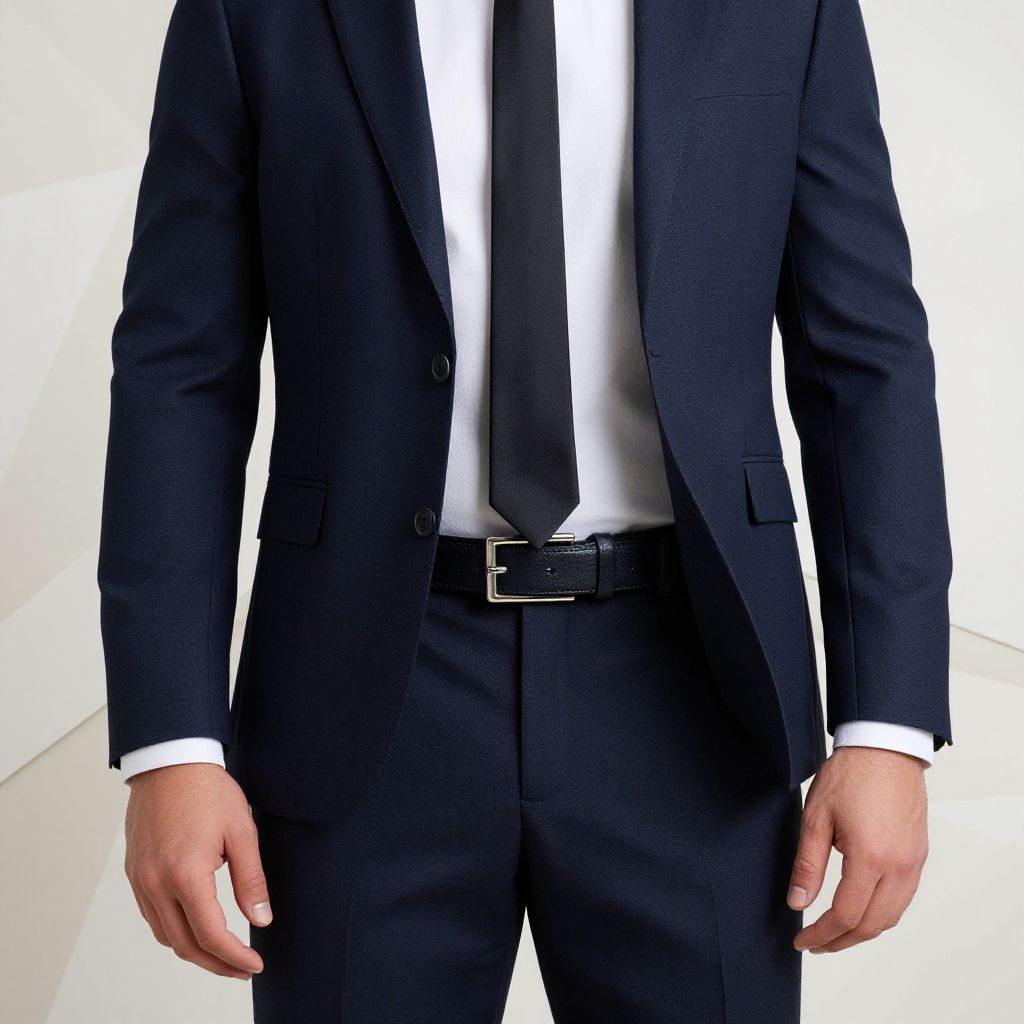 Statement belts for men, european man, a sophisticated european man in a sharp suit, wearing a minimalist yet striking statement belt, standing in a well-lit studio with a backdrop of abstract patterns and focused lighting
