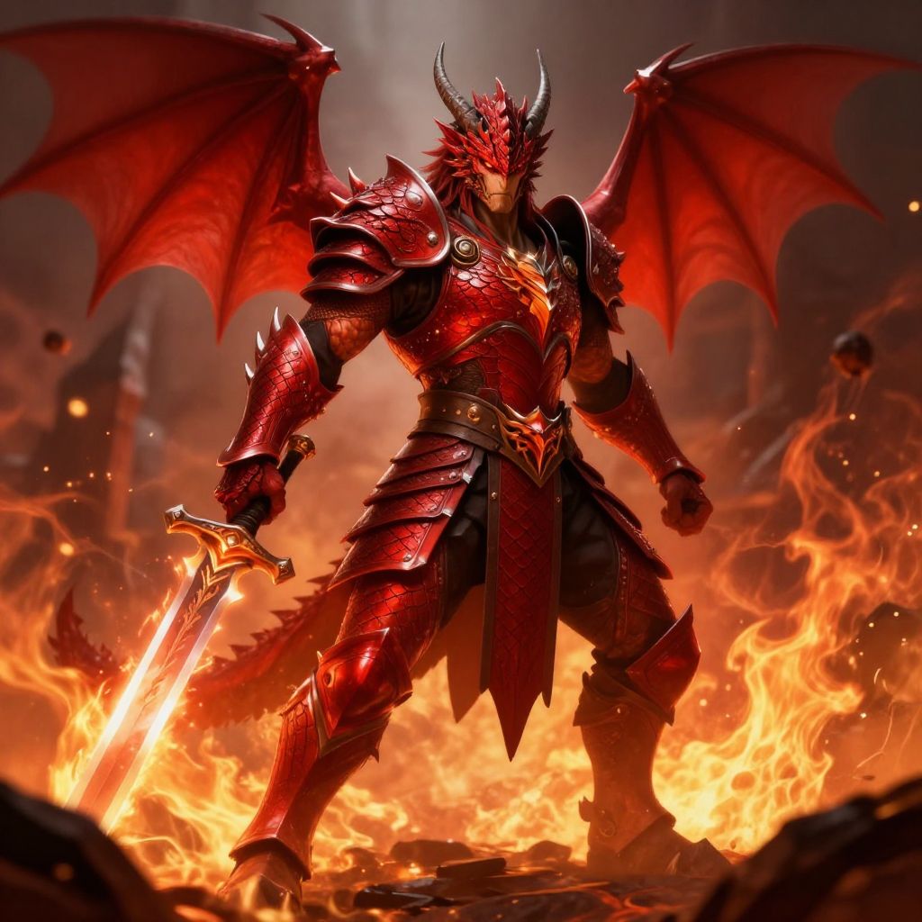 Red dragon ranger standing in a fiery battlefield, clad in intricate crimson armor with dragon scale patterns, wielding a glowing sword, fierce expression, intense flames and smoke swirling around, dynamic heroic pose, detailed fantasy art style.