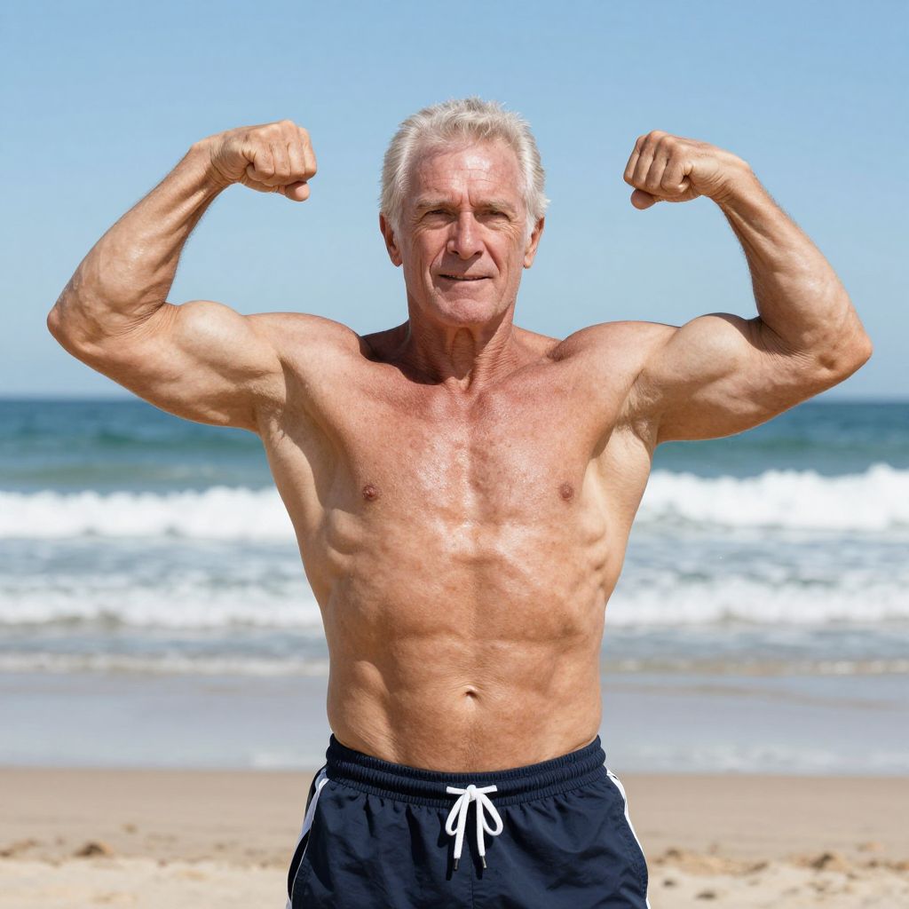A muscular elderly man flexes his well-defined abs and arms on a beach.