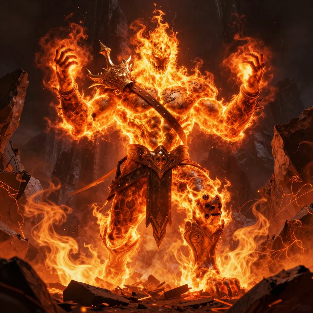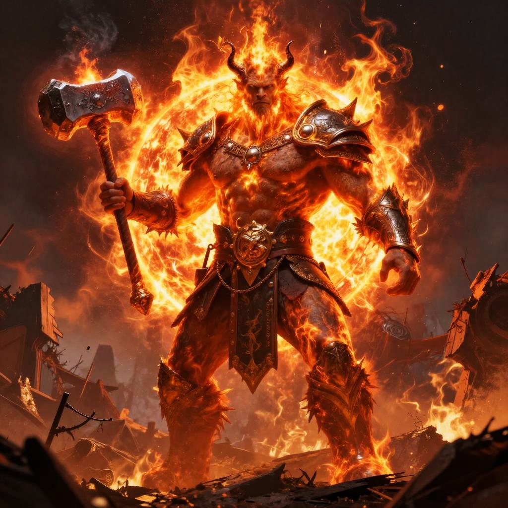 Surtr – Fire giant who will bring Ragnarok, portrayed as a brutal fire giant glowing with rage, surrounded by sparks and burning cinders, set in the desolate volcanic plains lit by eruptive bursts under a darkening blood-red sky.