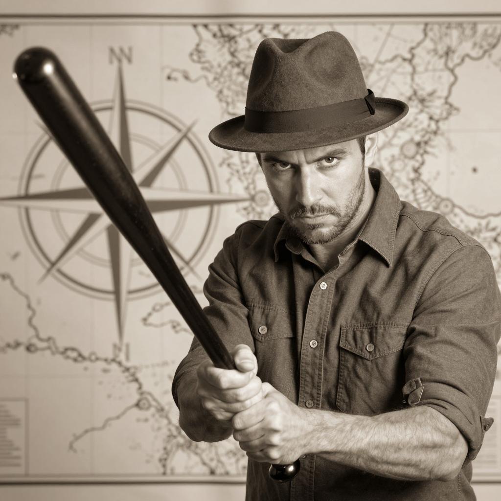 Photograph of a man in a brown fedora and button-up shirt, gripping a black bat, extending his right hand forward. Background features a sepia-toned map with circular compass rose. Man's intense gaze, determined expression. Brown hues dominate.