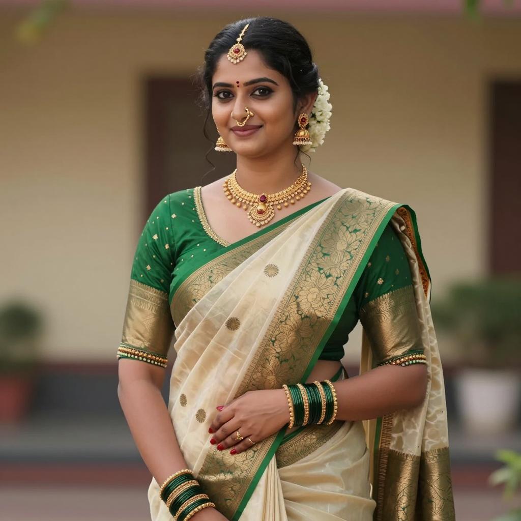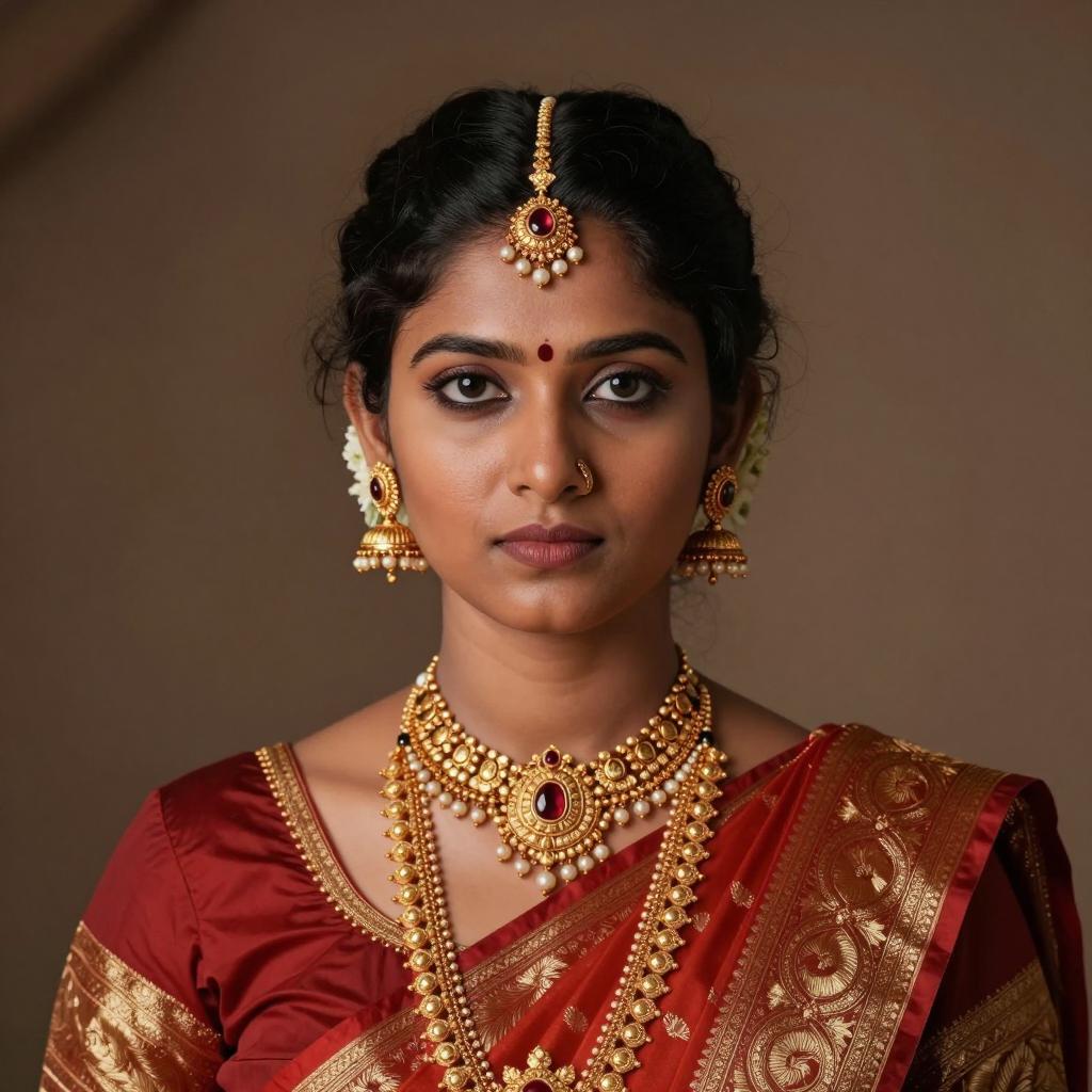 Portrait of an Indian woman wearing a red and gold ornate saree with intricate patterns. She has long, braided dark brown hair adorned with traditional jewelry including a maang tikka, jhumka earrings, and a detailed gold necklace with red gemstones. The woman has a light brown skin tone, symmetrical features, and subtle makeup, set against a soft brown background. The image captures a culturally rich, elegant, and traditional look with realistic lighting and fabric details.
