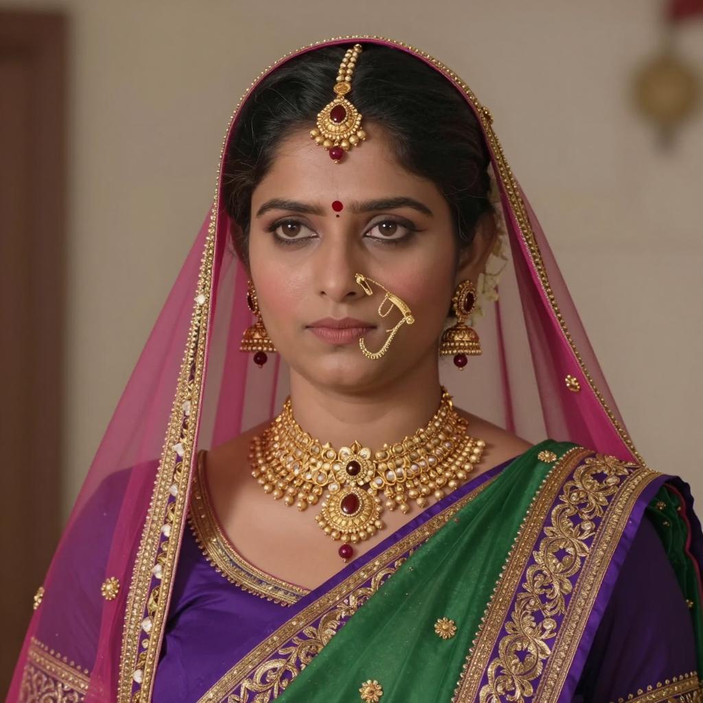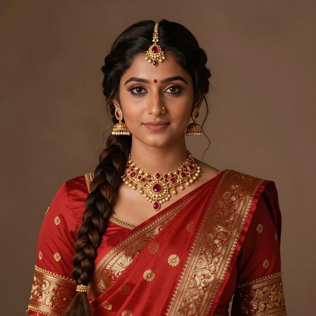 Simple hair style indian, digital portrait of an Indian woman, traditional jewelry, ornate red and gold saree, long braided dark brown hair, elaborate maang tikka and jhumka earrings, detailed gold necklace with red gemstones, soft brown background, realistic style, elegant expression, light brown skin tone, symmetrical features, detailed ures in fabric and hair, subtle makeup, portrait orientation, realistic lighting, culturally rich and traditional attire.