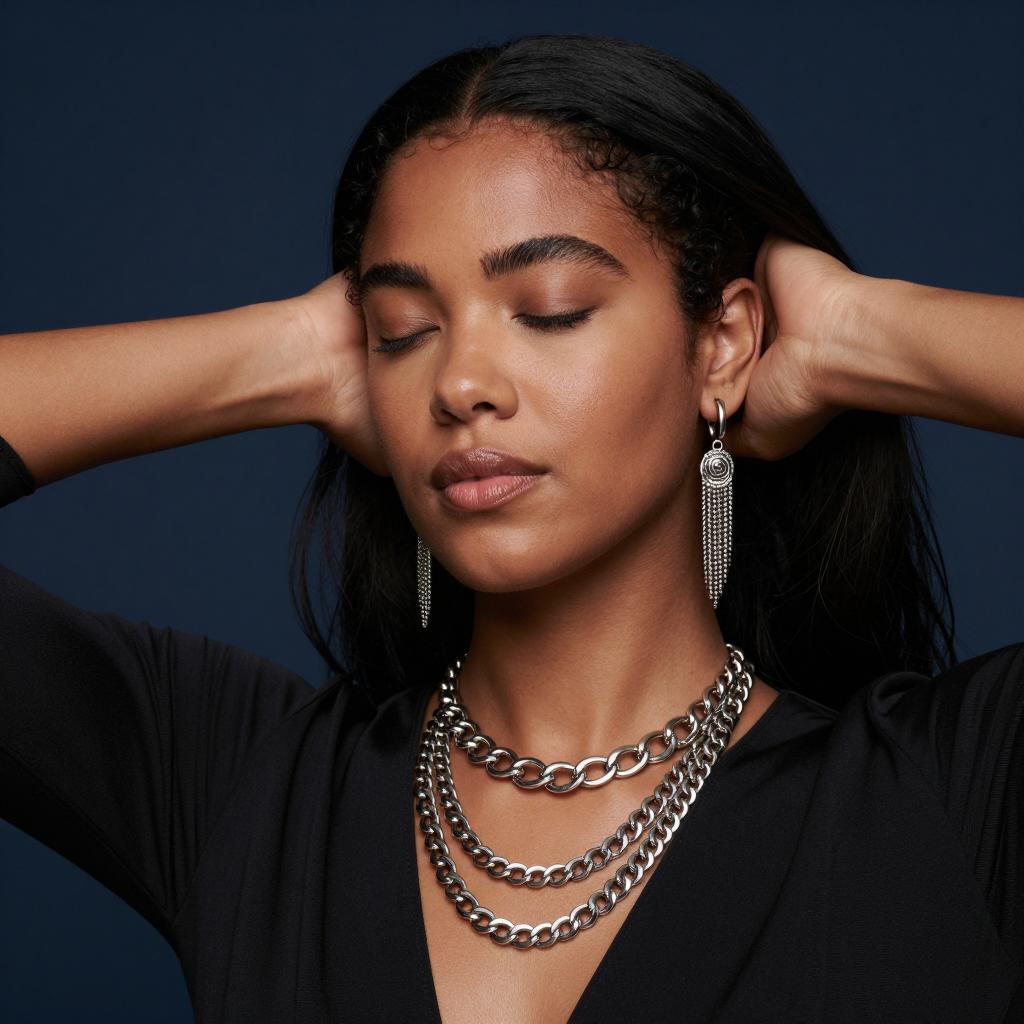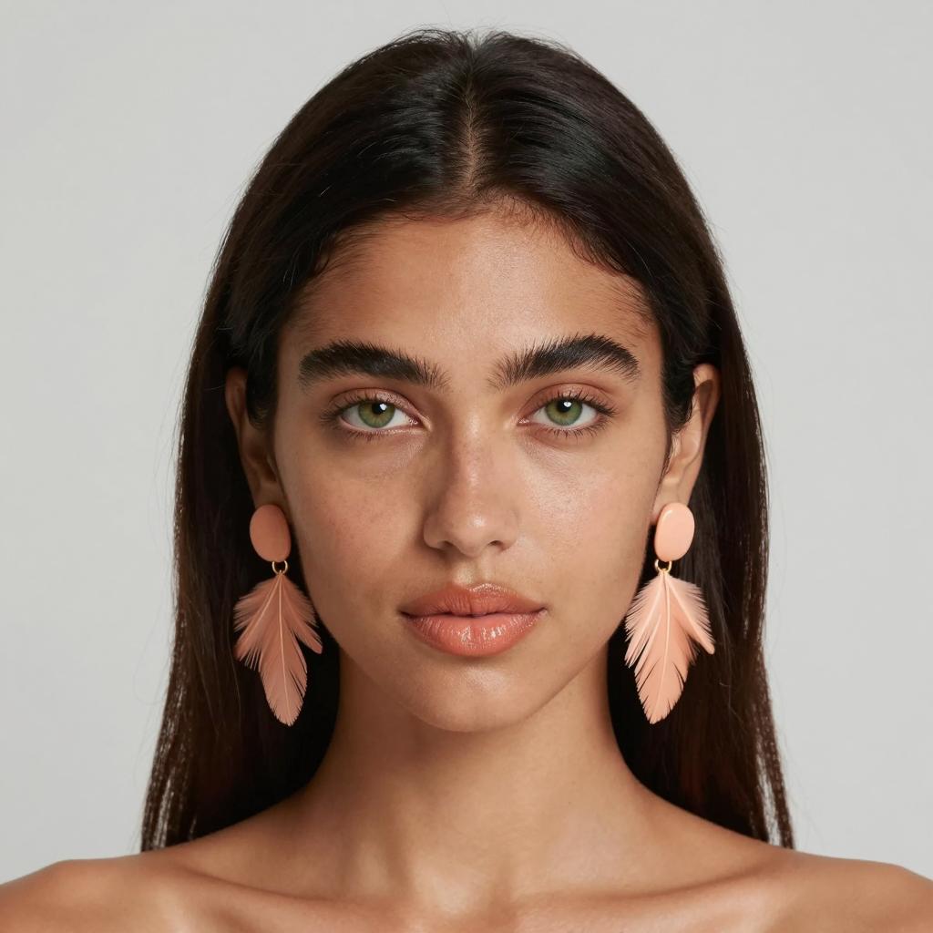 Photograph of a dark-skinned woman with smooth skin and intense gaze. She has black hair pulled back tightly. She wears large, decorative, white, feather-like earrings with silver details and an off-the-shoulder white dress with pleated fabric. The background is a beige wall. She has full lips and defined eyebrows. The sunlight casts shadows on her face.