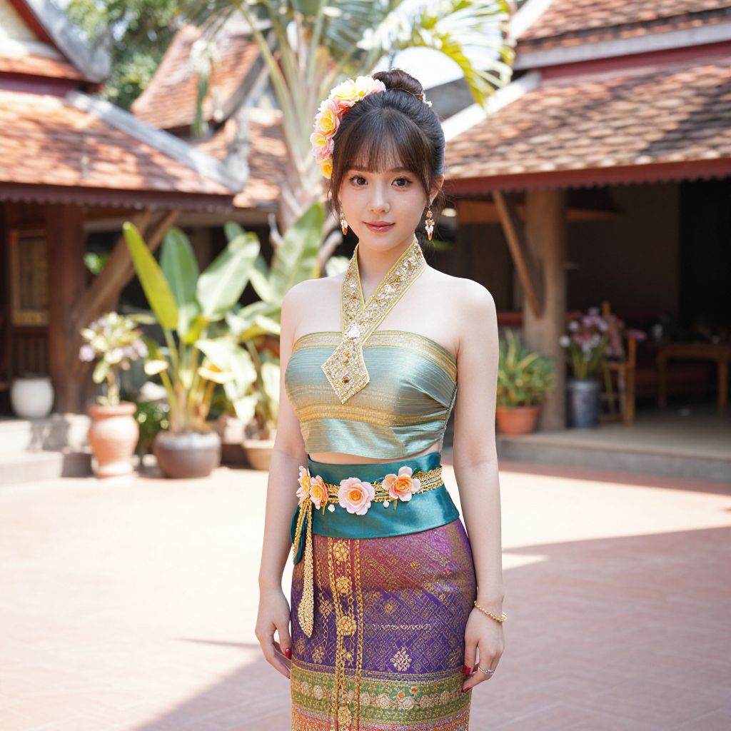 A young woman in her late 20s from Thailand wearing a vibrant and traditional Asia country costume, including a colorful silk saree with gold embroidery, a floral headpiece, and a floral waist sash, standing in a sunny courtyard of a traditional Thai village with tropical plants and red tiles in the background.. The woman has big tits and cute face