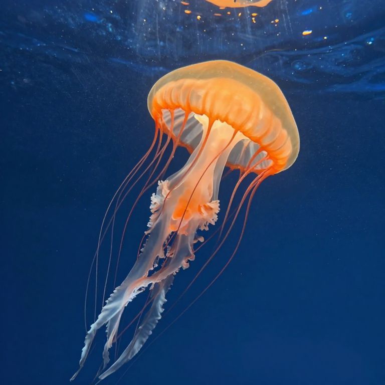 Glowing translucent jellyfish gracefully floats upward through deep blue waters, its vibrant orange bell and delicate white tendrils illuminated by sunbeams piercing the surface above.