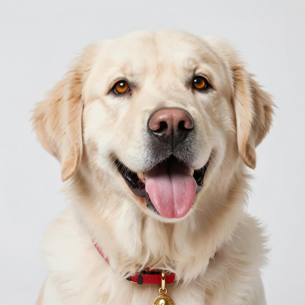 A close-up portrait of a happy golden retriever dog with expressive amber eyes, a big smile, and its tongue out. The dog wears a red collar with a decorative gold charm, and has smooth, light cream-colored fur. The background is plain white, highlighting the dog's joyful expression and detailed features.
