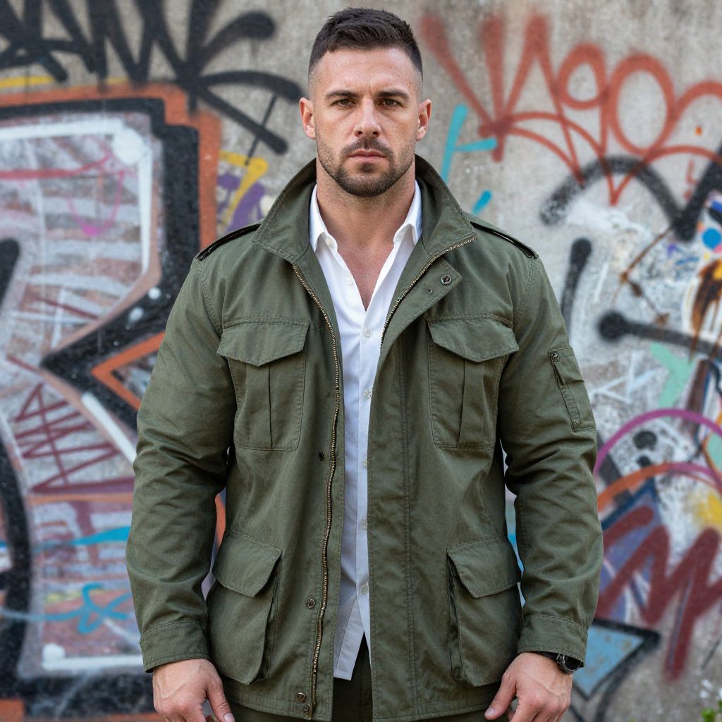 A photograph of a muscular, light-skinned man with short, dark hair and a slight beard. He's wearing a green military-style jacket over a white shirt, standing in front of a graffiti-covered wall with colorful tags and spray paint. His expression is neutral, and his hands are by his sides. The background is urban and gritty, adding a street-style vibe to the image.