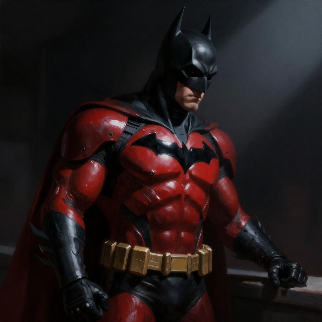 A digital painting of a Batman-like figure wearing a glossy, red and black armored suit. The muscular character stands in low light with a narrow beam of light illuminating the figure from the right. The suit features a prominent gold utility belt, a black bat emblem on the chest, and a red cape. The background is dark and shadowy, emphasizing the dramatic lighting and reflective textures of the armor.