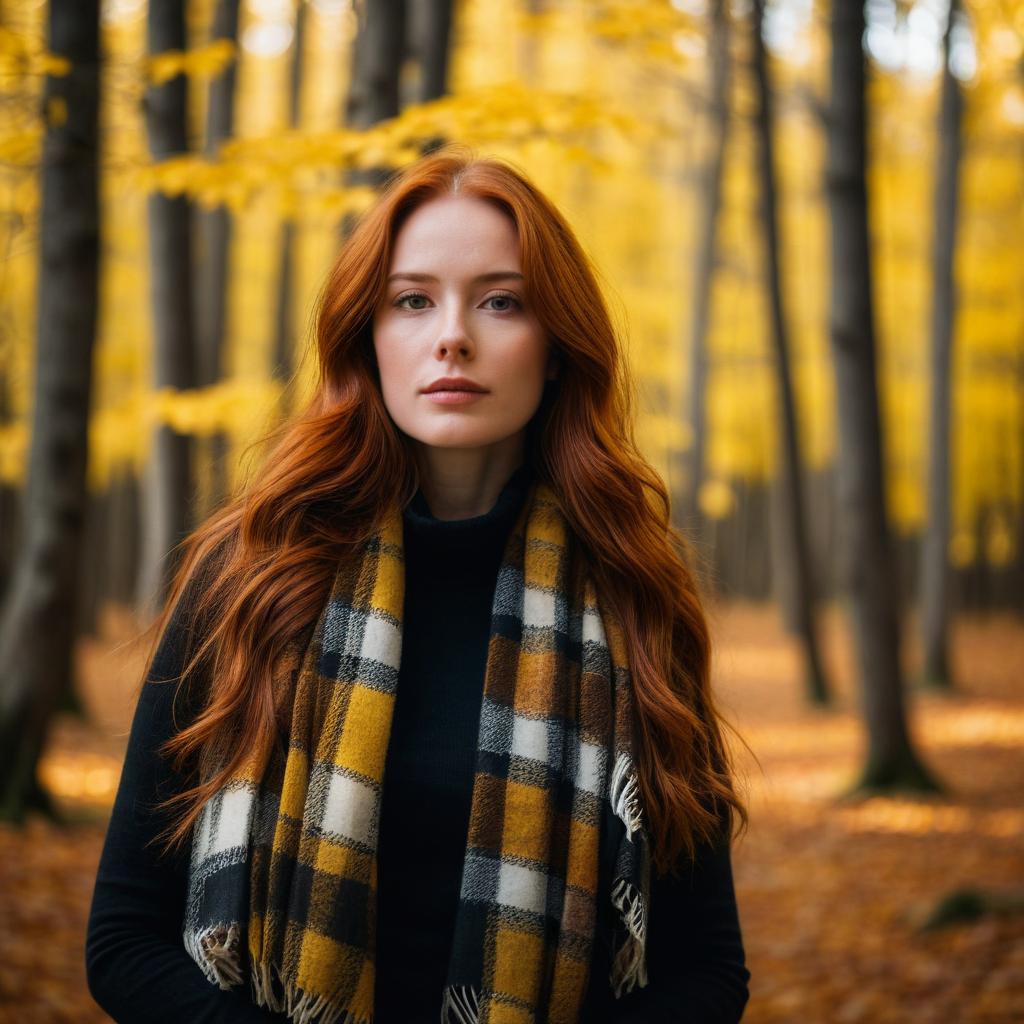 Portrait of a young woman with long red hair standing in a forest during autumn. She is wearing a black top and a yellow, black, and white plaid scarf. The background is filled with tall trees and yellow autumn leaves, creating a warm, moody, cinematic atmosphere with soft natural light.